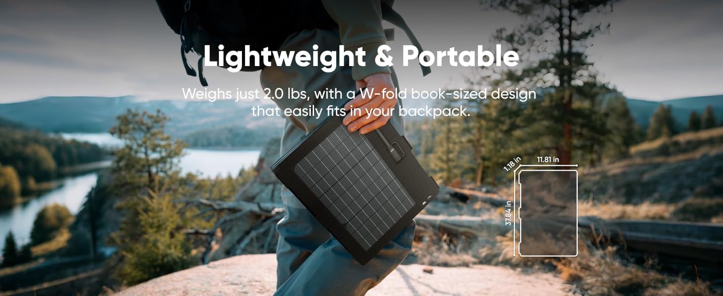 خفيفة الوزن للغاية وصغيرة الحجم. يزن SolarSaga 40W Air 1.98 رطلًا فقط، وهو أخف بنسبة 30% تقريبًا من اللوحات السائدة، وهو مثالي للمشي لمسافات طويلة أو الرحلات أو التخييم أو أي مغامرة. Its compact W-fold design folds to a book-sized panel for easy backpack storage, delivering portable solar energy on the go.