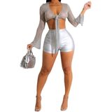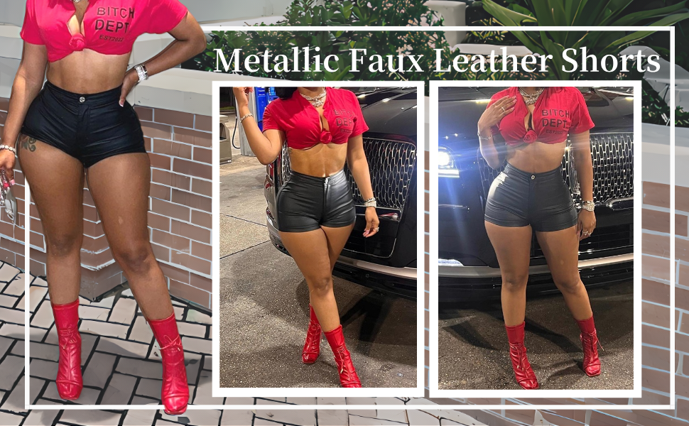 - المميزات - شورت جلدي نسائي، شورت معدني لامع، شورت مثير مثير، شورت عالي الخصر مع جيبين خلفيين، سحاب وزر للإغلاق.