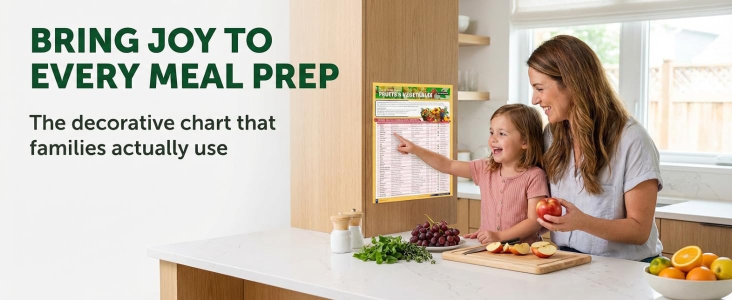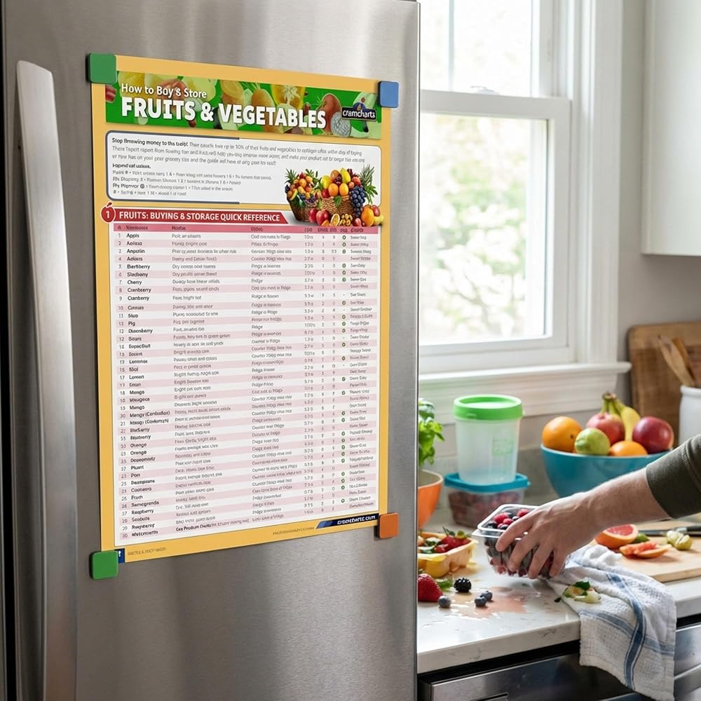 الدليل المرجعي السريع للفواكه والخضروات من Cramcharts - فترة صلاحية تخزين كاملة للشراء والنضج والنصائح العضوية - ملصق مكتبي أو جداري مصفح مكون من 4 صفحات للمطبخ والبقالة والمنزل