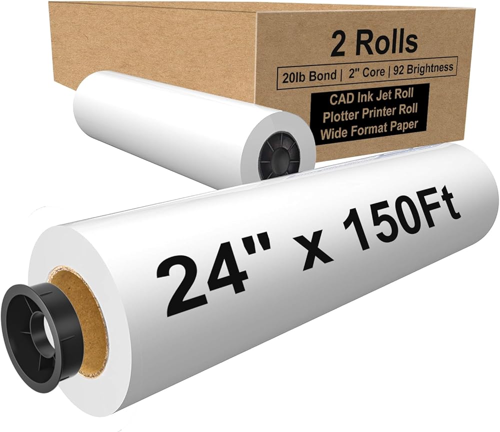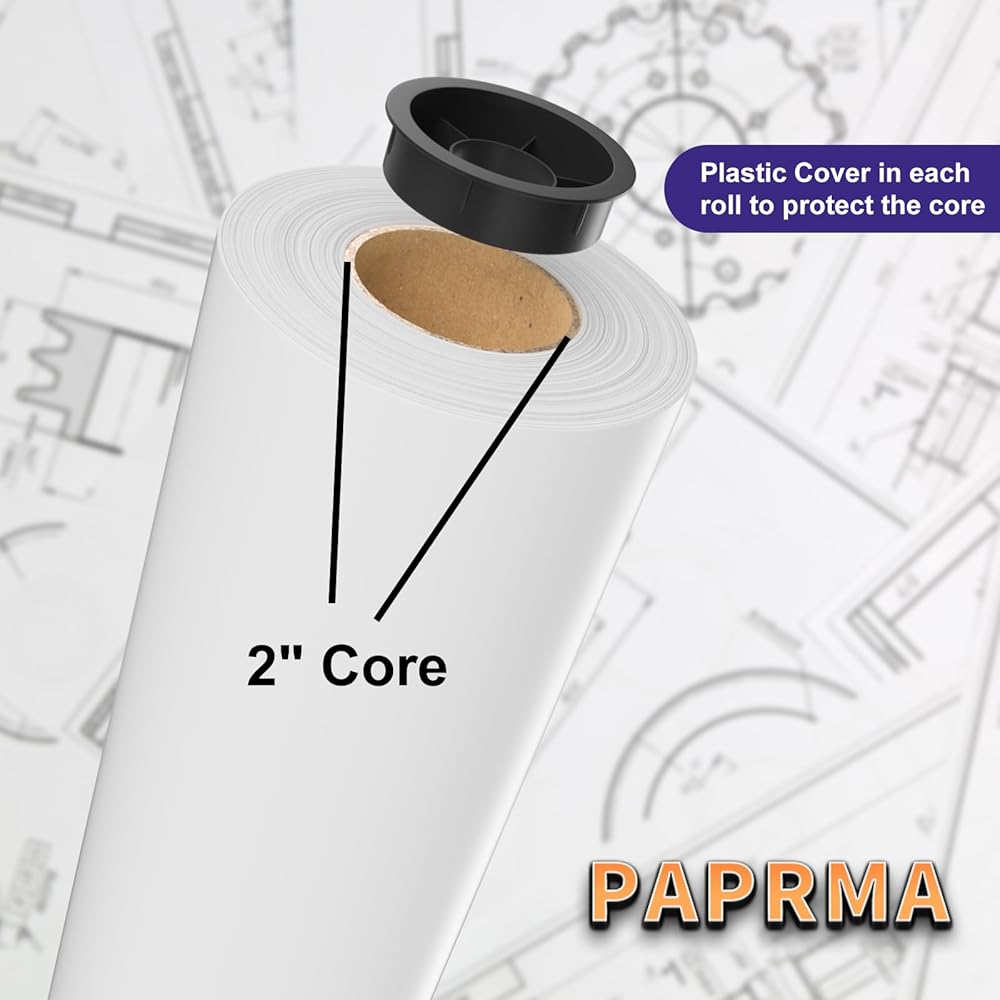 ورق تنسيق عريض مقاس 24 بوصة × 150 قدمًا، 2 بوصة، ورق رسم أبيض CAD السندات 2 لفات