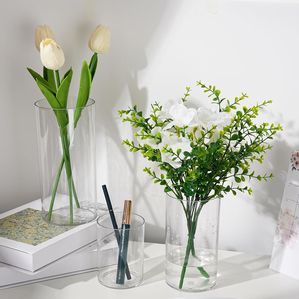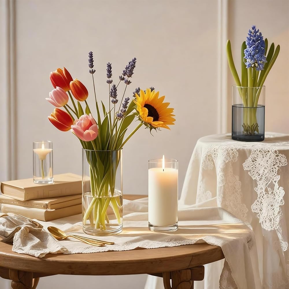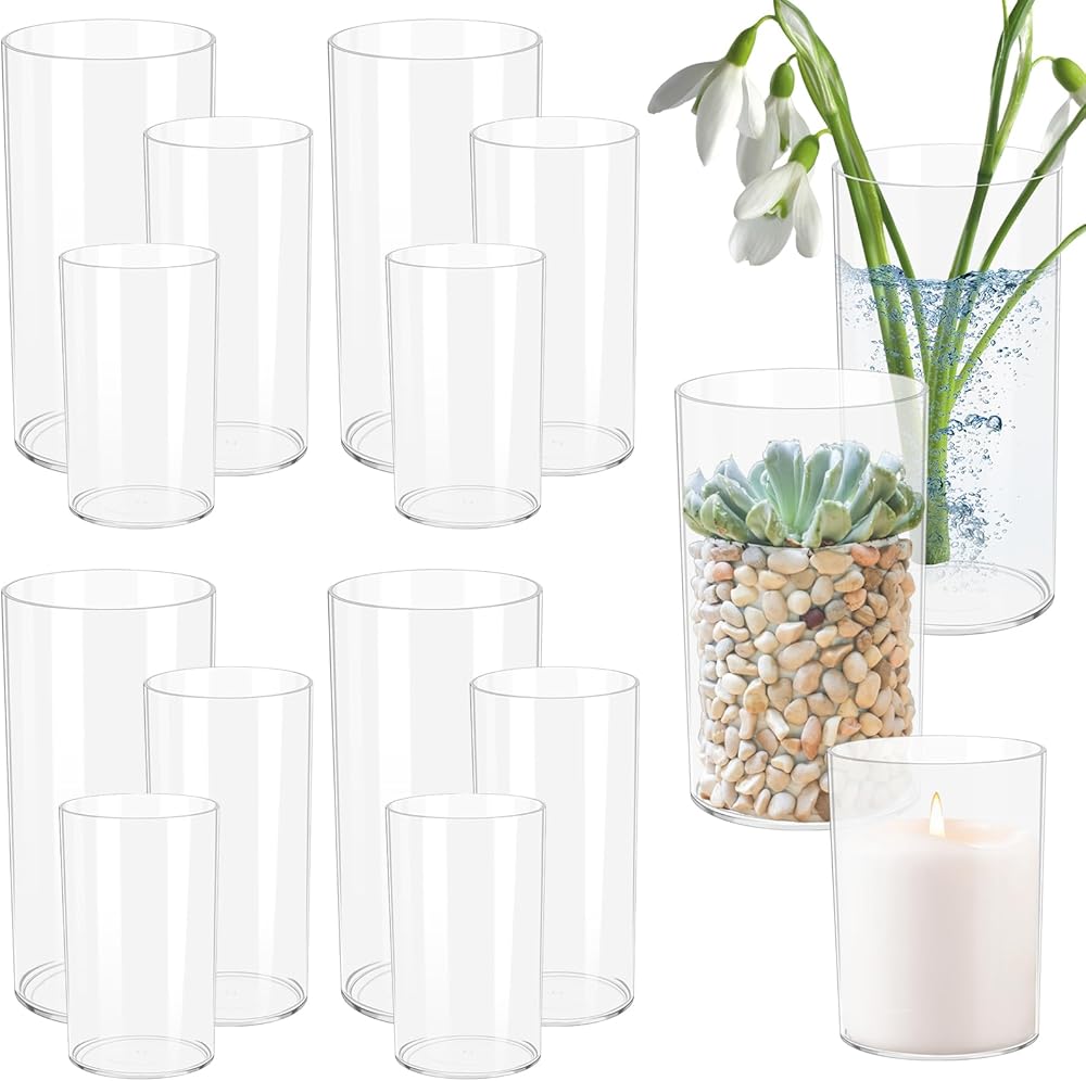 Transform your table or home décor with this Clear plastic Cylinder Vase Set of 12, featuring three essential sizes (4", 6", 8") to suit all your decoration needs. Whether you're creating a romantic wedding centerpiece, a cozy floating candle display, or a stylish flower arrangement, these versatile vases are the perfect choice. The premium-quality glass delivers high transparency and durability, making it suitable for both professional event planners and home enthusiasts. Designed with secure packaging, you can shop with confidence knowing your vases will arrive intact and ready to elevate your next décor project. From elegant dining settings to seasonal decorations, this vase set offers endless creative possibilities.