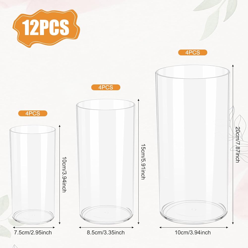 12 مجموعة من المزهريات الأسطوانية البلاستيكية الشفافة (4 قطع لكل منها: 4 بوصة، 6 بوصة، 8 بوصة) - مزهرية مركزية مزخرفة للزهور، والشموع العائمة، وديكور الزفاف والمنزل