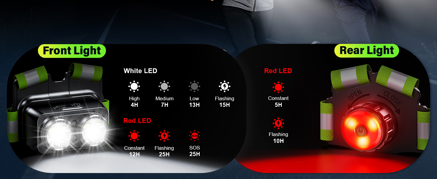• 【عمر بطارية طويل للغاية وشحن سريع】 يتميز مصباح الجري هذا ببطارية مدمجة قابلة لإعادة الشحن ذات سعة عالية تبلغ 2200 مللي أمبير في الساعة، وهو ما يتجاوز بكثير سترة الجري العادية. توفر السترة 4-25 ساعة من وقت تشغيل الضوء الأمامي و5-10 ساعات للضوء الخلفي. باستخدام كابل USB-C المزدوج المرفق، يمكنك شحن كلا المصباحين في وقت واحد - الضوء الأمامي خلال 2-3 ساعات، والخلفي خلال 25 دقيقة فقط - حتى تتمكن من التشغيل لفترة أطول دون قلق.