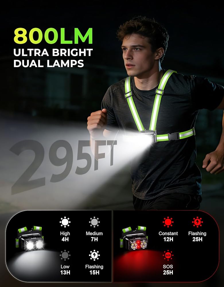 800LM فائقة السطوع و7+2 أضواء تشغيل للعدائين مع ضوء خلفي، شعاع 45 درجة وسترة عاكسة 360 درجة، سترة جري عاكسة للماء IPX4 للمشي/الركض ليلاً، وقت تشغيل من 4 إلى 25 ساعة