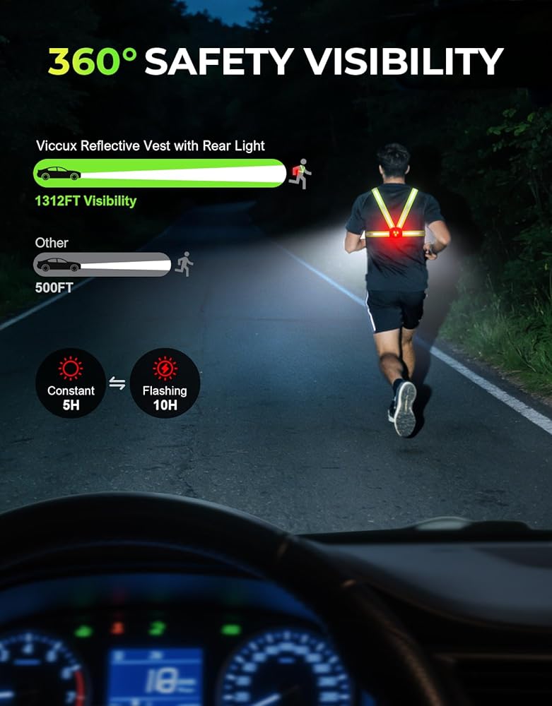 • 【سطوع فائق ورؤية 360 درجة】 يضيء الضوء الأمامي 800 لومن لأضواء الجري للعدائين المسار حتى 90 مترًا للأمام، بينما يظل ضوء الأمان الخلفي مرئيًا من مسافة تصل إلى 400 متر. على عكس السترة العاكسة السلبية، يضمن نظام الإضاءة النشط هذا البقاء مرئيًا. مع أشرطة عاكسة 360 درجة، تضمن الحماية الشاملة، مما يجعلها أكثر أمانًا من المصابيح الأمامية التقليدية للجري الليلي وركوب الدراجات والركض.