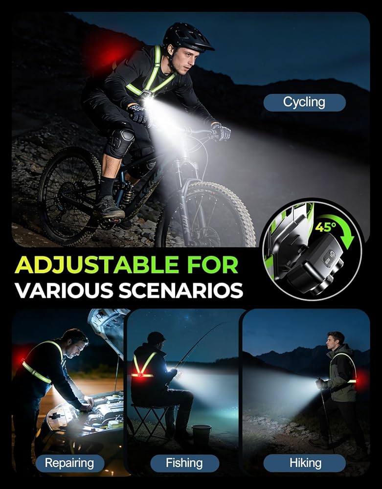 • 【7+2 أوضاع وشعاع قابل للتعديل】 تعمل سترة الجري العاكسة هذه على تخصيص الضوء الخاص بك من خلال 7 أوضاع إضاءة أمامية (بما في ذلك الوميض والثبات) ووضعين للإضاءة الخلفية، جميعها يمكن التحكم فيها عبر مفاتيح مستقلة. يتيح لك الشعاع القابل للتعديل 45 درجة توجيه الضوء عند الحاجة، سواء كان مائلاً لأسفل للتركيز على العوائق عند قدميك أو تجنب الوهج، للأمام من أجل وضوح المسار. مثالية للجري على الطرق والمشي لمسافات طويلة والبيئات الحضرية.