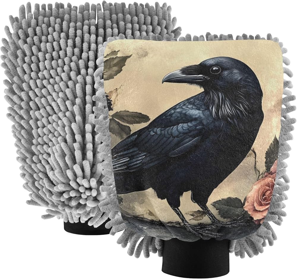 قفاز غسيل السيارات من AIXIWAWA، قفاز غسيل مقاوم للخدش، ماص للماء، 2 عبوة متوسطة الحجم بطباعة وردة على شكل غراب قوطي