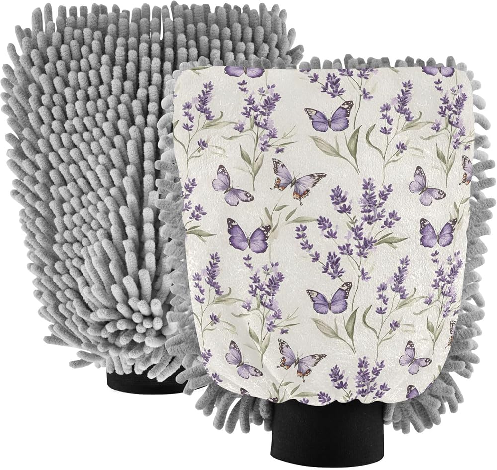 قفاز غسيل السيارات من AIXIWAWA قفاز غسيل على شكل فراشة لافندر مطبوع خالٍ من الخدوش وممتص للماء، عبوة من قطعتين متوسطة الحجم in Kuwait
