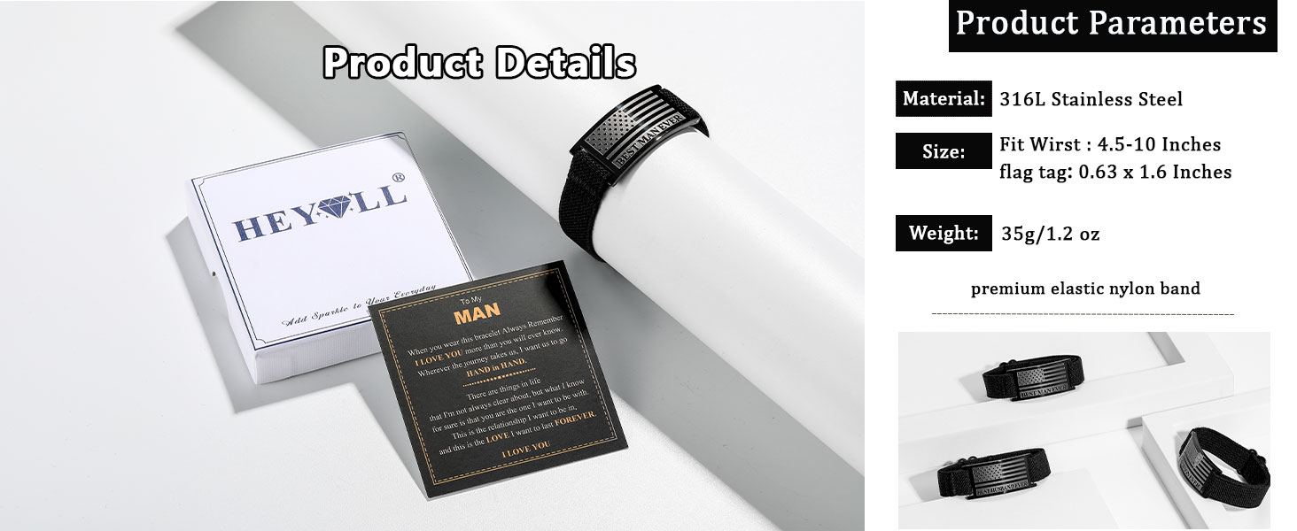 هيكل متين: مصنوع من مزيج من شريط النايلون المرن الممتاز والفولاذ المقاوم للصدأ 316 المتين، يضمن هذا السوار متانة طويلة الأمد مع توفير ملاءمة مريحة. لقد تم تصميمه ليتحمل البلى والتمزق اليومي، مما يضمن بقاءه هدية عزيزة لسنوات قادمة.