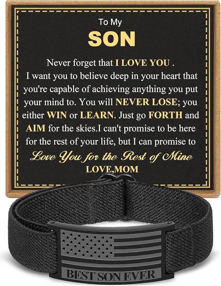 إلى ابني: يتميز سوار Heyoll My Son من Dad بنقش فريد من نوعه للعلم الأمريكي و"Best Son Ever" مما يجعله هدية رومانسية مثالية له. مثالية للتعبير عن إعجابك وحبك.