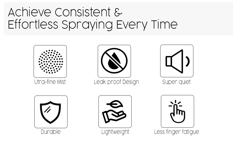 أداء الرذاذ المستمر: يتميز بتقنية الضغط المسبق المتقدمة لتوفير رذاذ ناعم مستمر لأكثر من ثانية واحدة مع كل ضغطة - مما يضمن تغطية مثالية من البداية إلى النهاية.