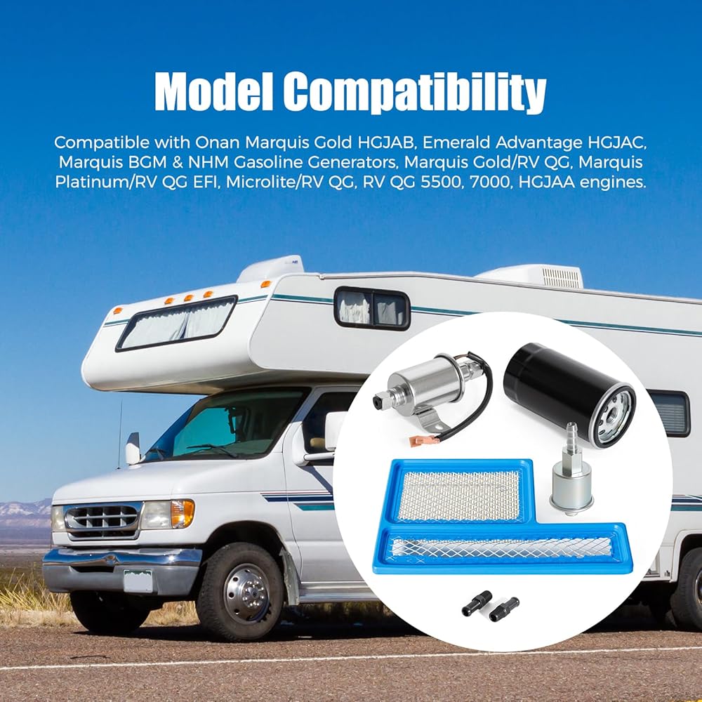 • 【Model Compatibility】Compatible with Onan Marquis Gold HGJAB, Emerald Advantage HGJAC, Marquis BGM & NHM Gasoline Generators, Marquis Gold/RV QG, Marquis Platinum/RV QG EFI, Microlite/RV QG, RV QG 5500, 7000, HGJAA engines. The onan 5500 fuel pump and accompanying filters ensure precise fit for each model, minimizing potential fit-related adjustments and supporting smooth maintenance processes.