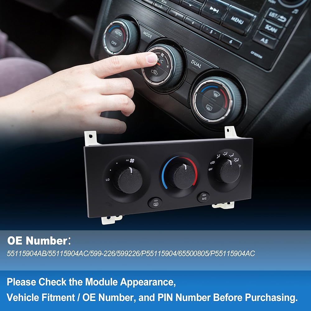 [رقم OE] يحل محل رقم OE: 55115904AB/55115904AC/599-226/599226/P55115904/65500805/P55115904AC. للتأكد من أن وحدة لوحة التحكم AC هذه تتوافق مع سيارتك، يرجى التحقق من مظهر الوحدة، وتركيب السيارة / رقم OE، ورقم PIN قبل الشراء.