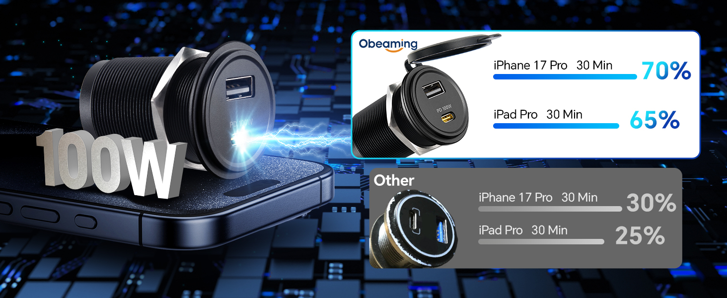 شحن سريع متزامن ثنائي المنافذ: مقبس USB RV مزود بمنفذ USB-C بقدرة 100 واط ومنفذ USB-A بقدرة 18 واط. قم بشحن جهاز كمبيوتر محمول أو Starlink Mini أثناء الشحن السريع للهاتف أو كاميرا لوحة القيادة أو جهاز العرض المحمول - كل ذلك بسرعات عالية ومتسقة. تعمل شريحة التعزيز المدمجة على تنظيم التيار والجهد بذكاء لتوفير توصيل الطاقة الأمثل. متوافق تمامًا مع جميع الأجهزة التي تعمل بمنفذ USB، فهو يلبي احتياجات شحن الأجهزة المتعددة للعائلات أو الفرق أثناء التنقل
