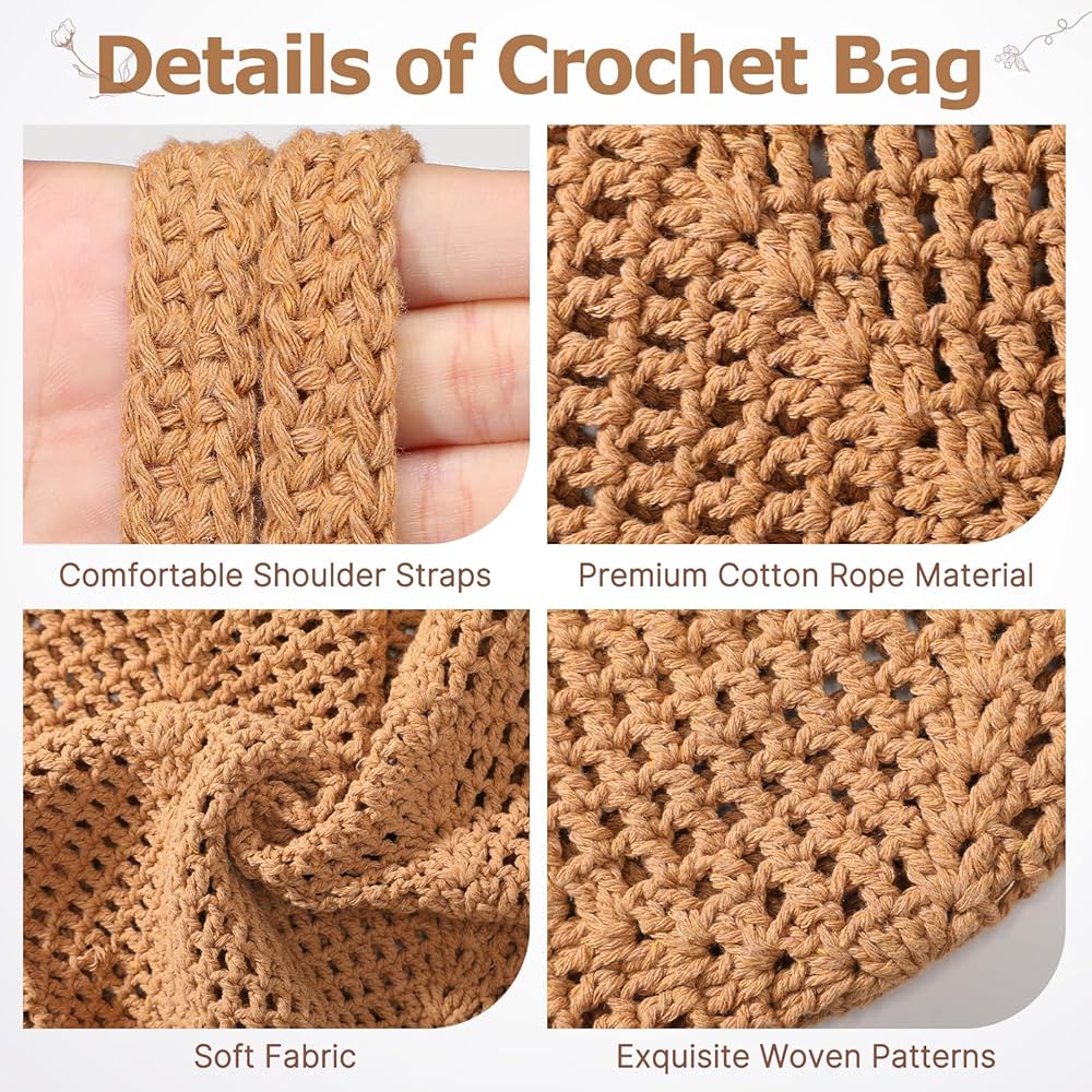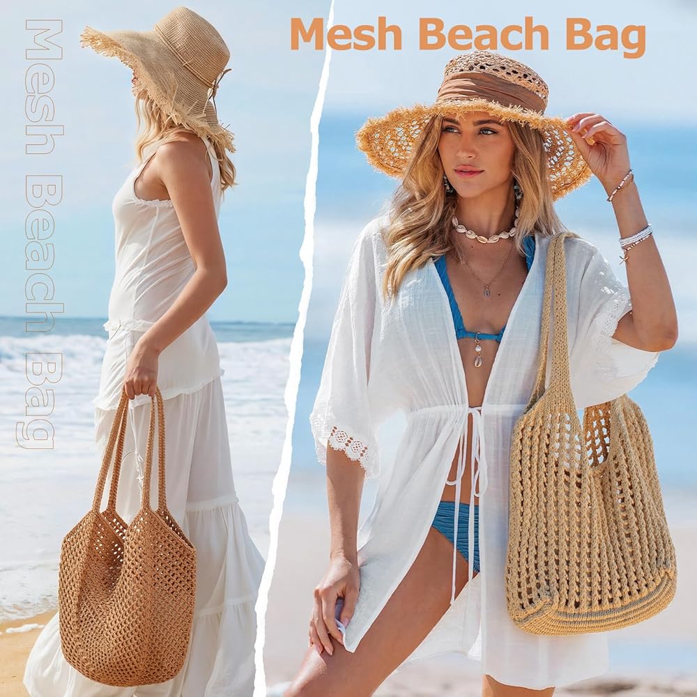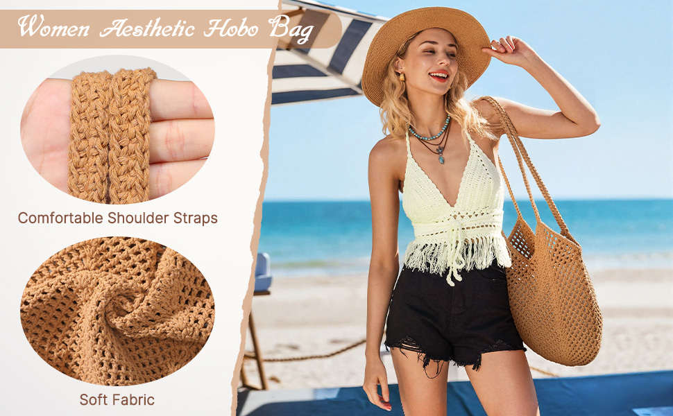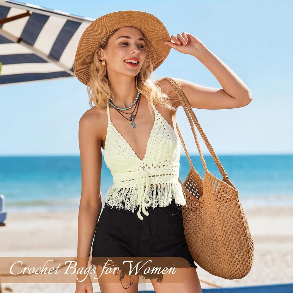 خامة ممتازة: حقيبة كروشيه مصنوعة يدويًا مصنوعة من حبل قطني للحصول على طراز بوهيمي أنيق وخفيف الوزن. وحقائب الشاطئ النسائية ناعمة وقابلة للطي لسهولة حملها. ملحق أساسي لعطلتك
