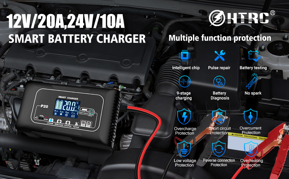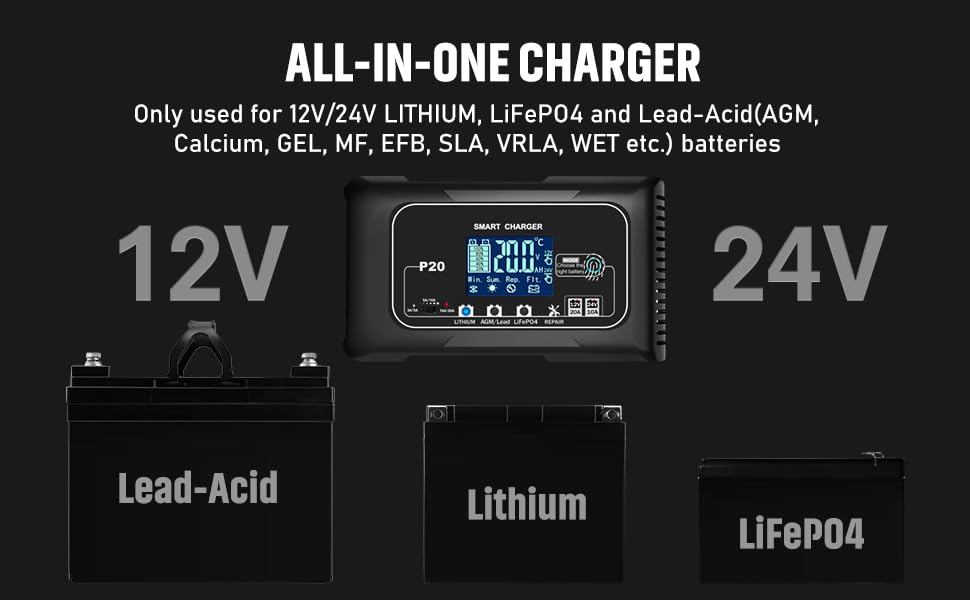 • يستخدم على نطاق واسع - شاحن بطارية السيارة 20 أمبير يشحن جميع بطاريات الليثيوم 12 فولت/24 فولت، LiFePO4، وحمض الرصاص (AGM/Gel/SLA..) بتيار أقصى 20 أمبير! تضمن البداية بلمسة واحدة تشغيلًا خاليًا من المتاعب، بينما يتناسب التصميم المدمج بسلاسة مع المرائب أو القوارب أو مجموعات السفر. مثالي للشحن السريع للبطاريات المختلفة والمركبات الكبيرة مثل الشاحنات والقوارب والدراجات النارية وعربات الجولف والجرارات ومركبات RVs. ملاحظة - لن يبدأ تشغيل البطارية أو إصلاح البطارية المفقودة تمامًا، فجهد البطارية لا يقل عن 2 فولت.