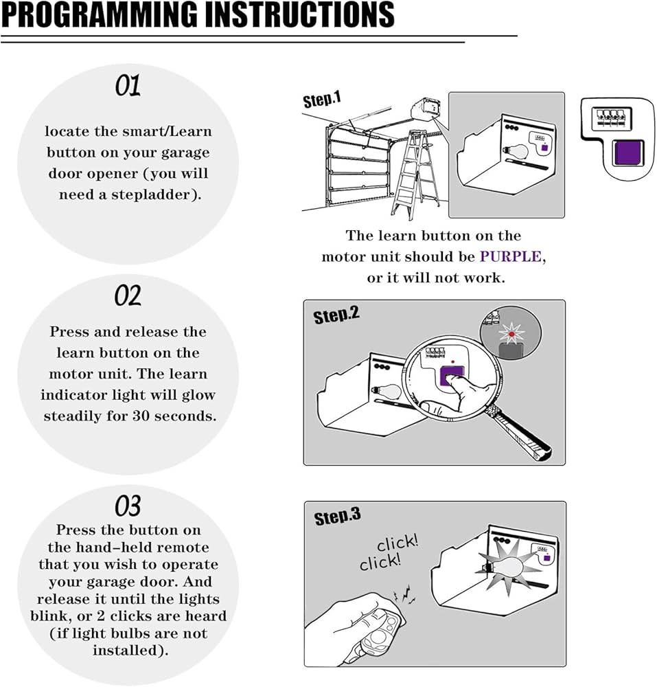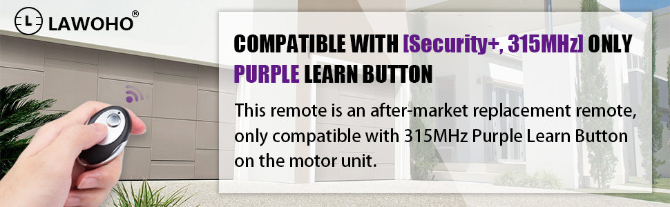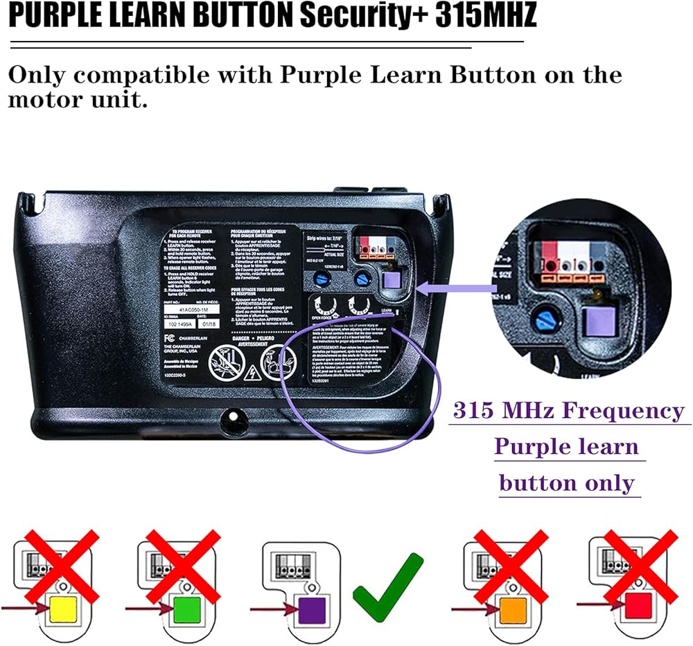 • متوافق فقط مع أجهزة فتح أبواب الجراج LiftMaster وChamberlain Security+ 315 ميجا هرتز التي تحتوي على زر تعلم أرجواني وهوائي أرجواني على وحدة المحرك