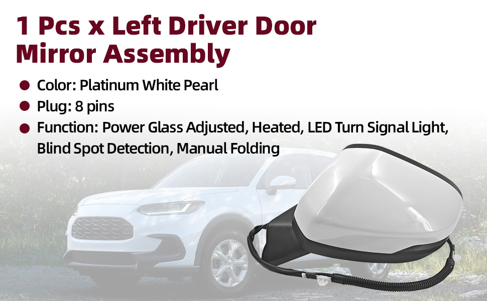 【قائمة العبوة والمواصفات】قطعة واحدة × مجموعة مرآة الباب بالجانب الأيسر؛ القابس: 8 دبابيس؛ الوظيفة: زجاج الطاقة قابل للتعديل، ساخن، ضوء إشارة الانعطاف LED، كشف البقع العمياء، طي يدوي
