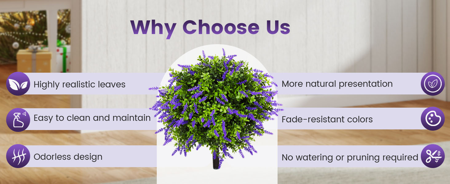 مواد فاخرة، متانة طويلة الأمد: تتميز شجرة الشجيرة الاصطناعية اللافندر هذه بقاعدة مثقلة بالأسمنت لتحقيق الثبات والشعور الفاخر. يتم تثبيت النباتات بشكل آمن في مكانها. مع معالجة خاصة مقاومة للأشعة فوق البنفسجية، فإنه يحافظ على لونه حتى عند وضعه تحت ضوء الشمس المباشر على الشرفات أو الشرفات، مما يجعله قطعة ديكور مثالية للاستخدام الداخلي أو الخارجي.