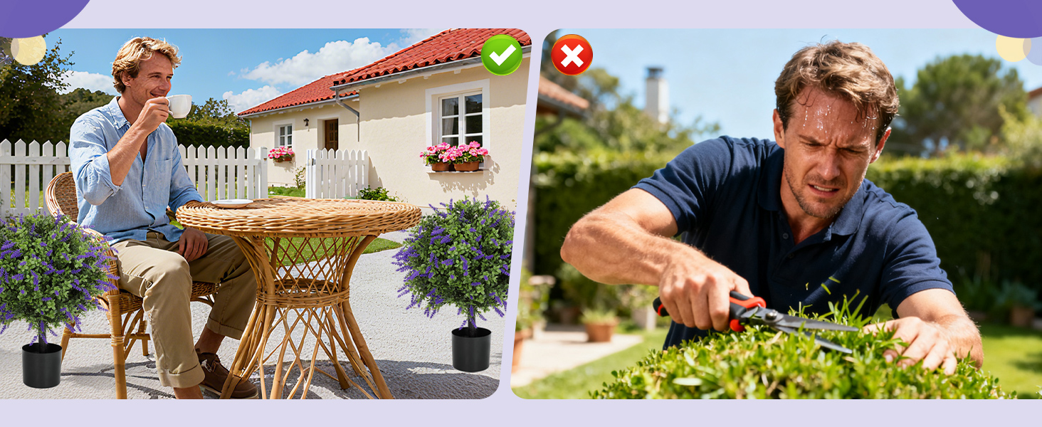 جاهز للاستخدام، ديكور خالٍ من المتاعب: يتطلب الجزء العلوي من الخزامى الخاص بنا دقيقتين فقط للإعداد بعد إخراجه من العلبة - ما عليك سوى إدخاله في القاعدة، وتشكيله بلطف، وزغب كل ساق. يوفر التصميم ذو الوعاءين قيمة أكبر، مما يسمح بوضع متناسق لتعزيز التأثير البصري والجمال المتناغم