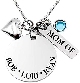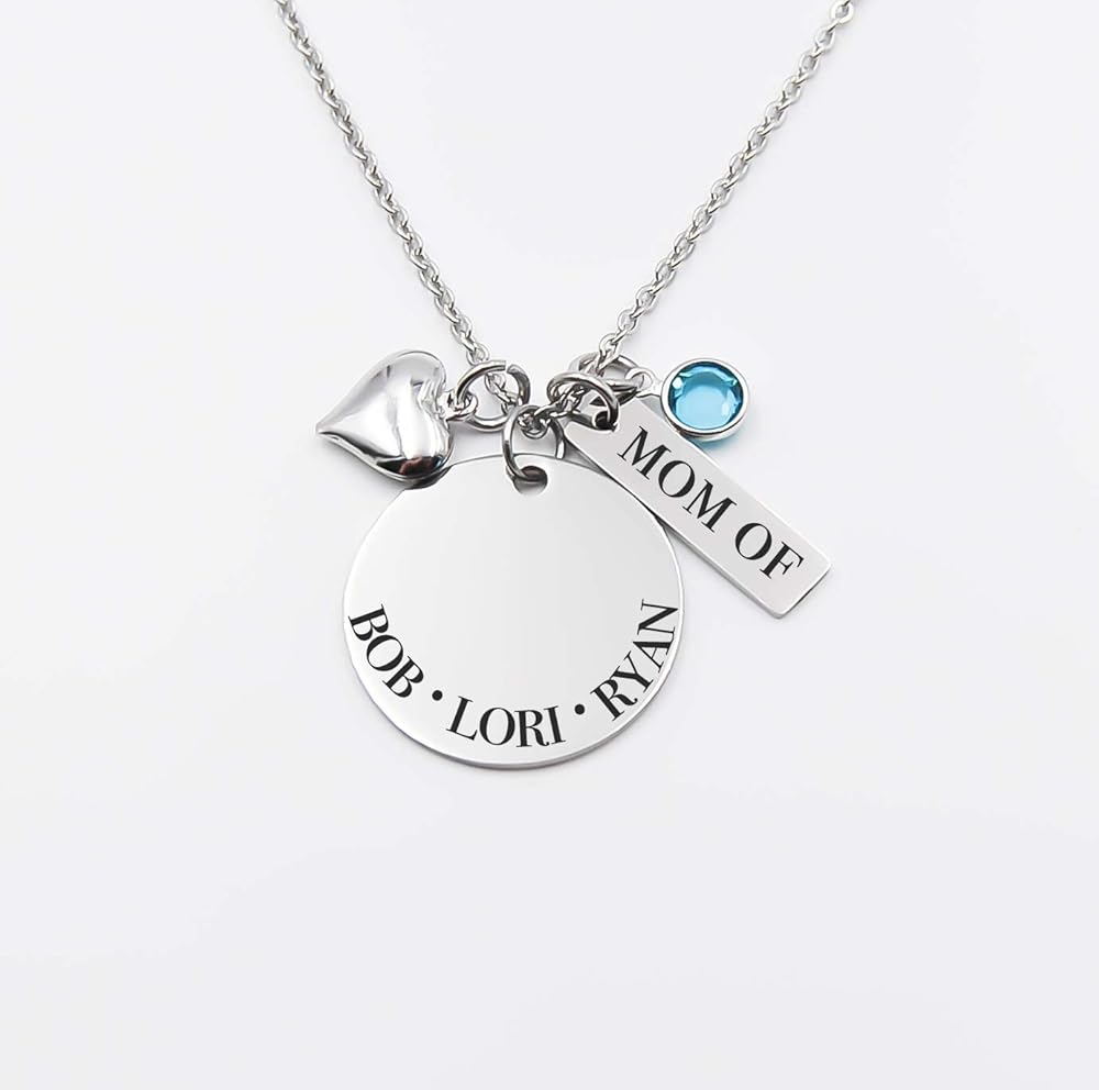 This is a beautiful Stainless steel disc personalized with names, and a rectangle personalized with Mom, Mommy, Grandma, Granny, Grams, Aunt of...Etc.. pendant necklace. with 1 swarvolski crystal of choice (More can be added) and silver tone Heart. Dangles from a complimentary stainless steel chain or upgraded chain of choice.