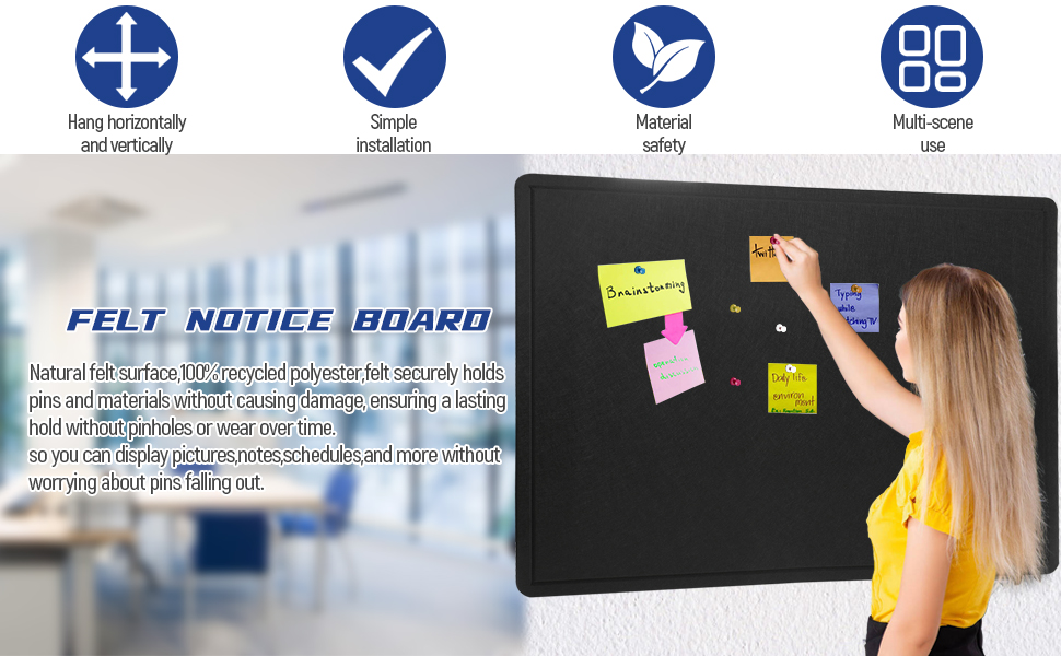 سهلة الاستخدام: تحتوي لوحة اللباد على شريط فيلكرو على ظهرها لسهولة التركيب. والفيلكرو ذاتي اللصق وعالي اللزوجة لمنع أي خطر سقوطه. يرجى تركيبه على المناطق الملساء مثل الزجاج والبلاط وطلاء اللاتكس والأبواب، وليس على المناطق غير المستوية مثل جدران الحجر الجيري. ويمكن أن يسمح الفيلكرو بالإزالة الآمنة من معظم الجدران دون التسبب في أي ضرر.