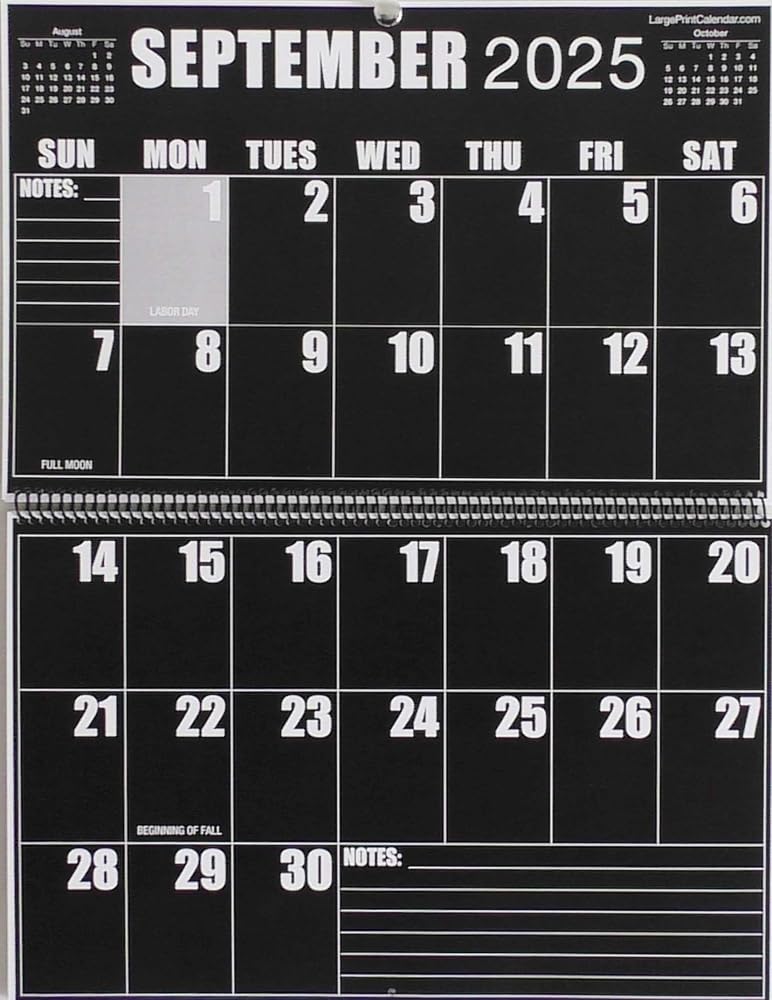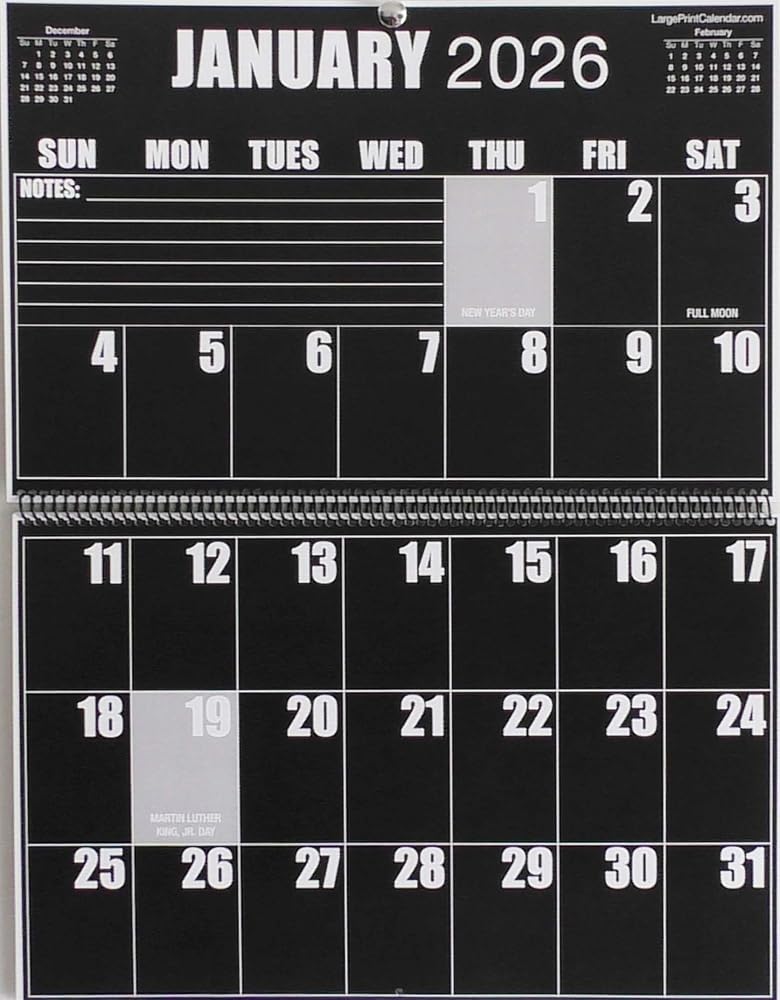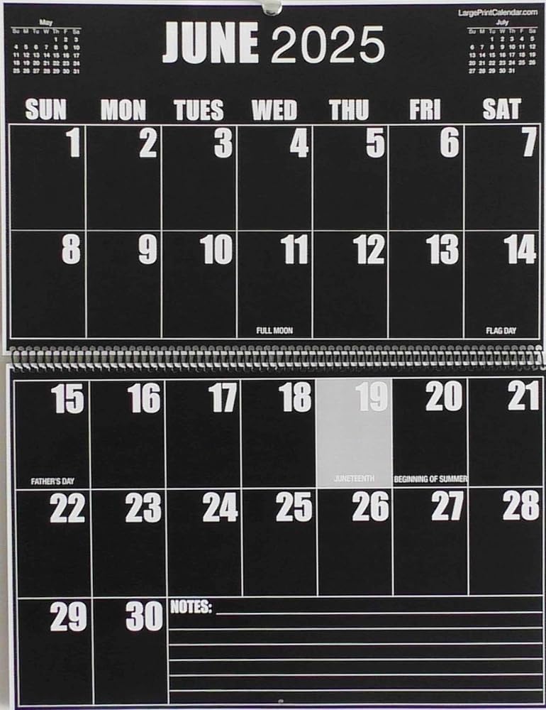 The High-Contrast Invert Calenedar is made by Jumbo Large Print, Jumbo Driven by Demand. This calendar is all black with white letters and lines making it awesome hanging anywhere. It measures 22" x 17" when opened up and hanging on the wall. It is made of heavy paper and days are in squares and each month shows holidays, full moons and other special events coming up.