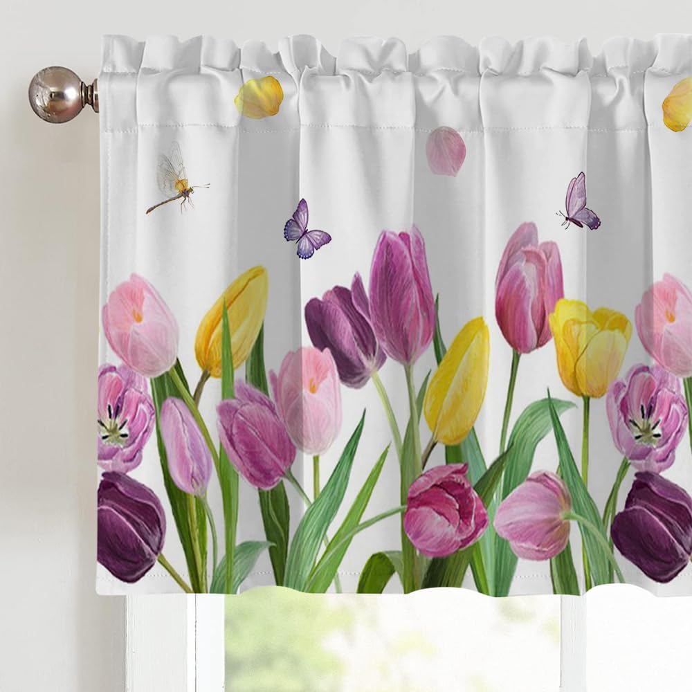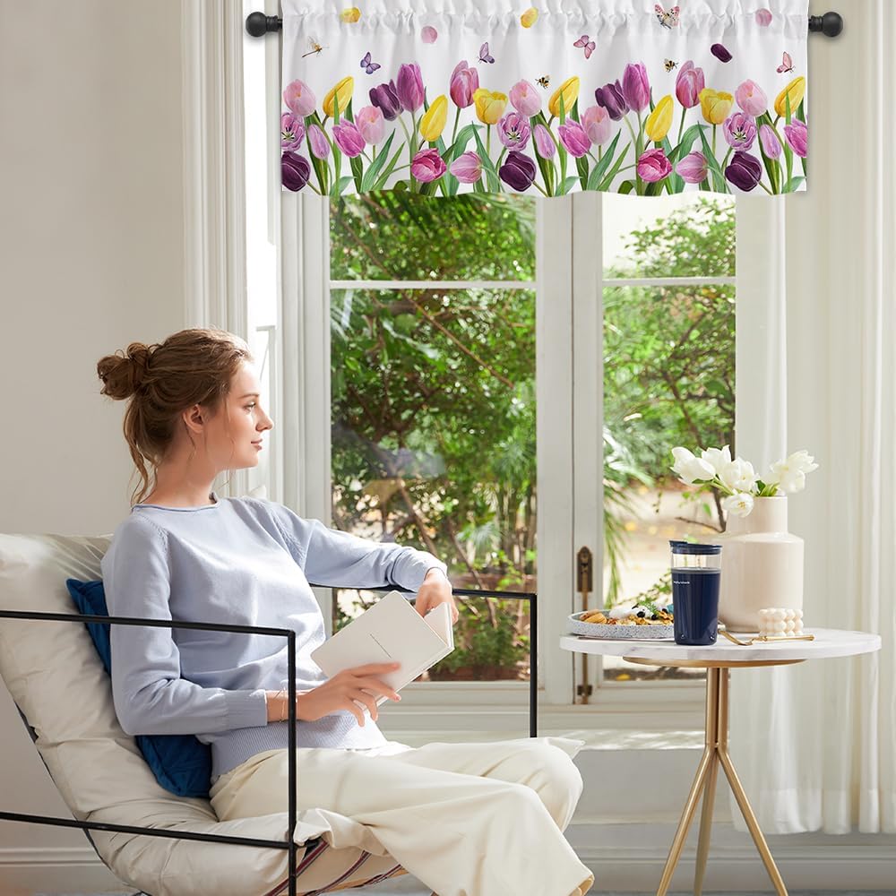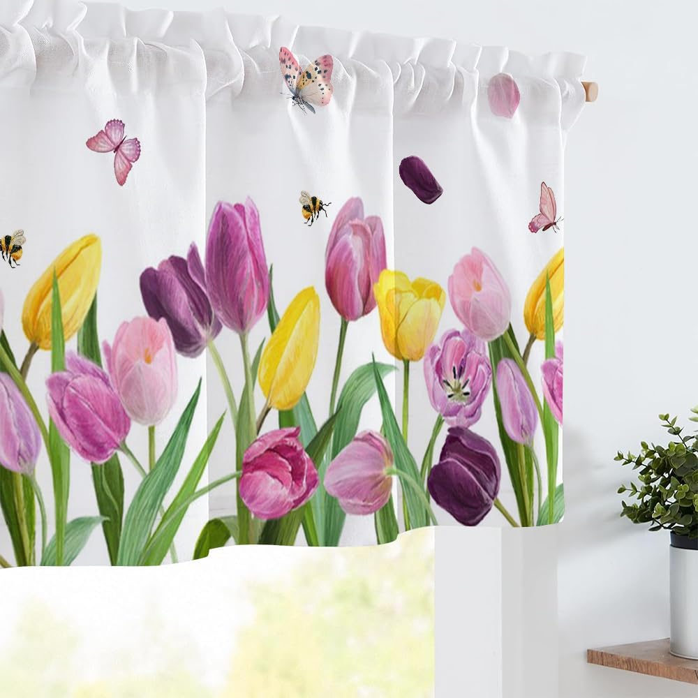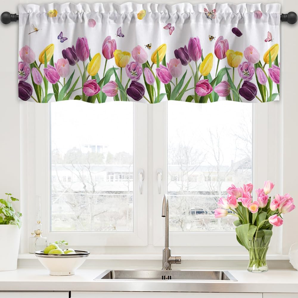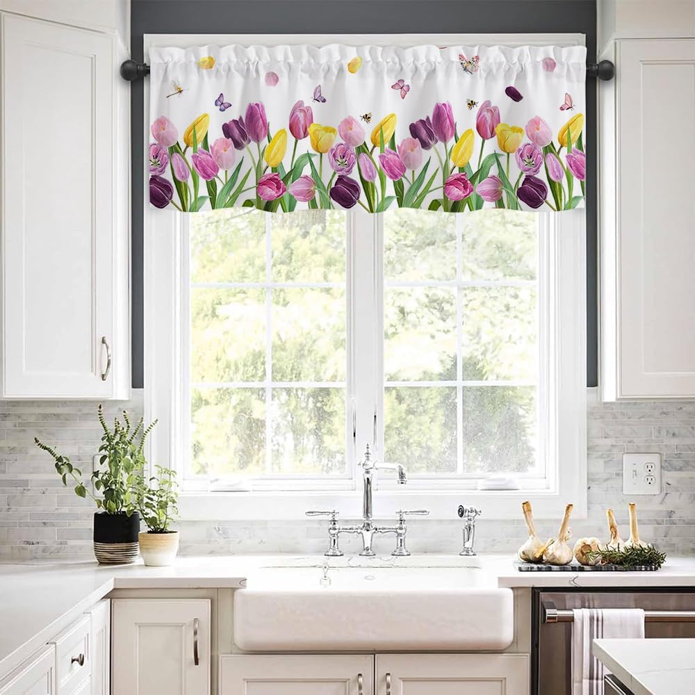 SUPERIOR MATERIAL: These Spring Kitchen valances are made of polyester, durable, soft, comfortable and skin-friendly. These nice tulips valances for kitchen windows are not easy to fade and keep their vibrant colors after multiple washes.
