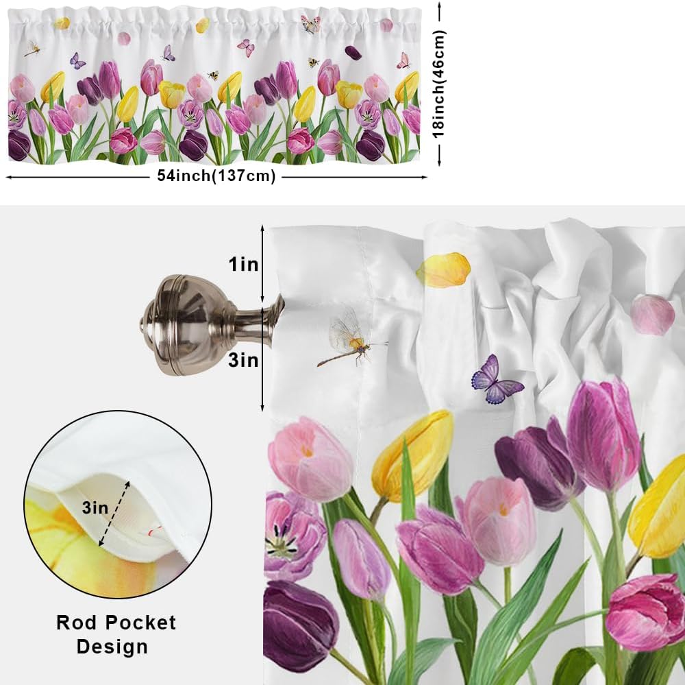 KITCHEN CURTAINS SIZE:Spring tulips kitchen valacne curtains measure 54 inches wide x 18 inches long. Our tulips valance curtains rod pocket size is 3 inches, fits most standard rods or decorative curtain rods/poles, easy to install and slide, can be easily and perfectly hung on standard curtain rods.