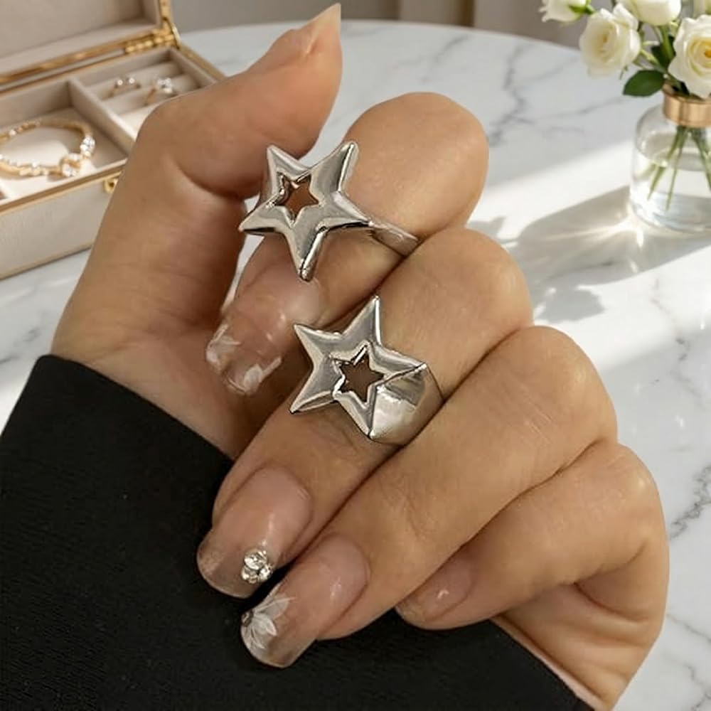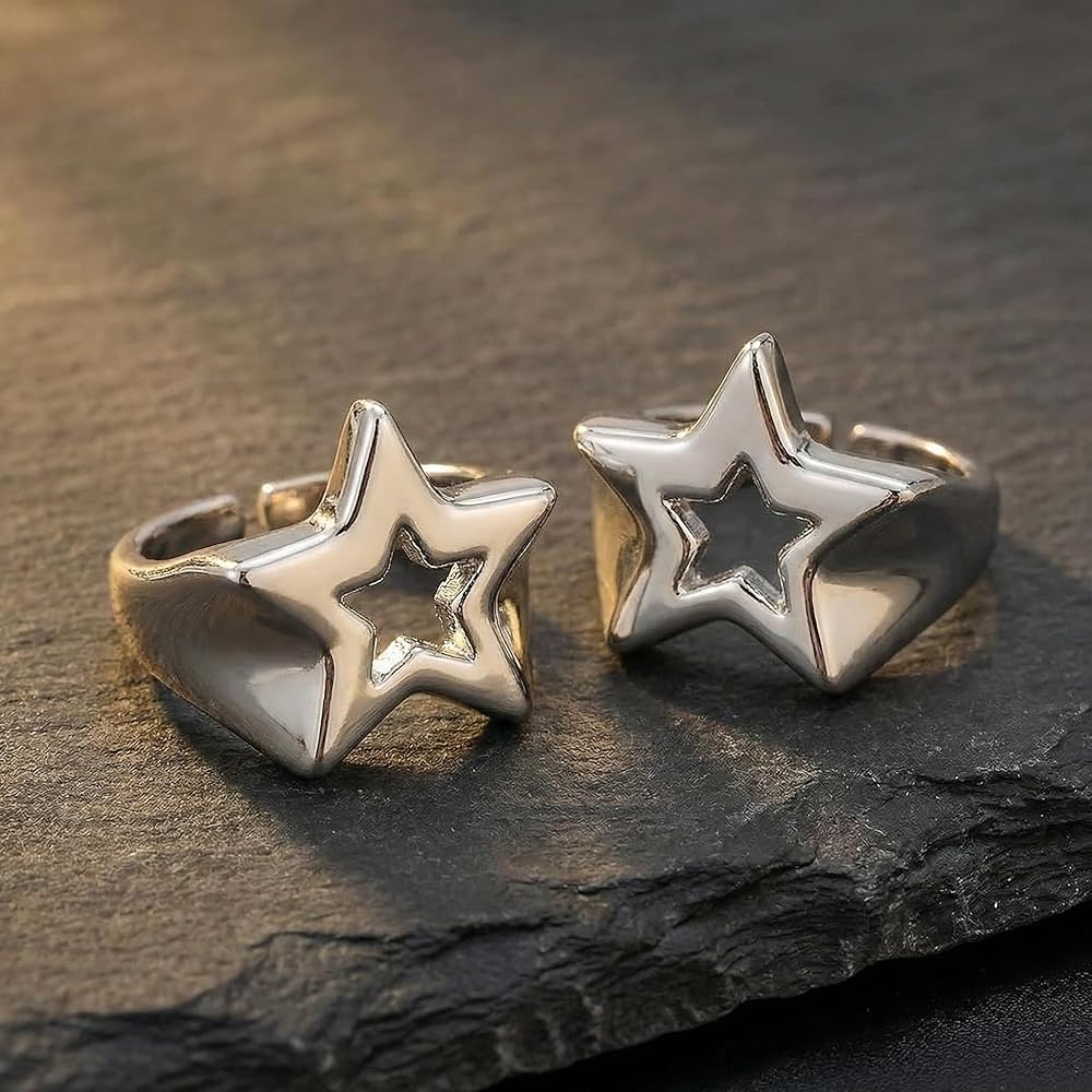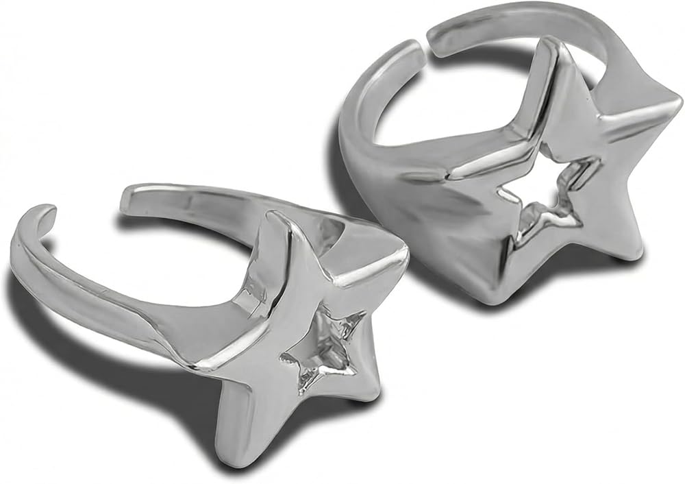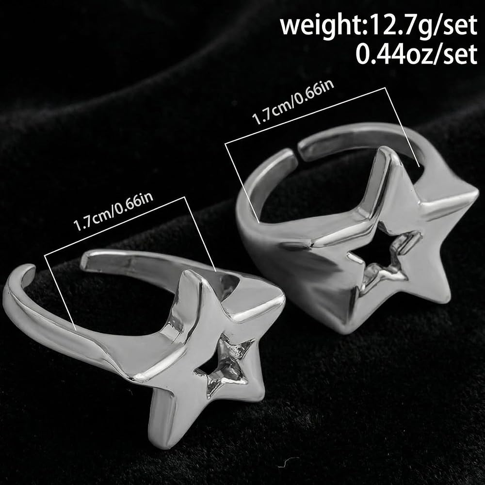 • TRENDY DESIGN:This cool 2-pack ring set. Featuring a bold star shape with a hollow center, these rings capture the essence of 2000s retro fashion, making them a accessory for streetwear, or hip-hop styles