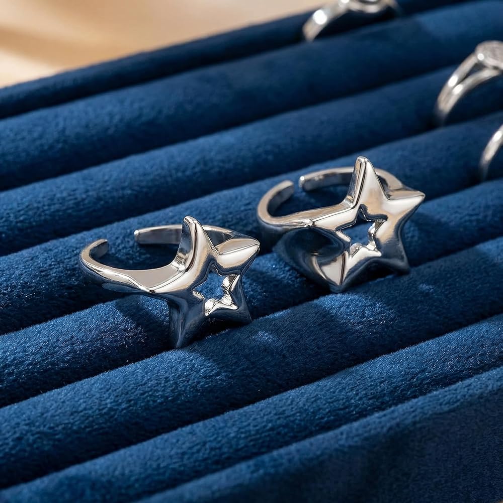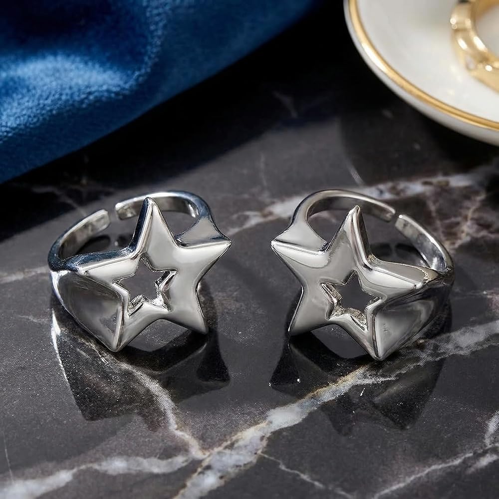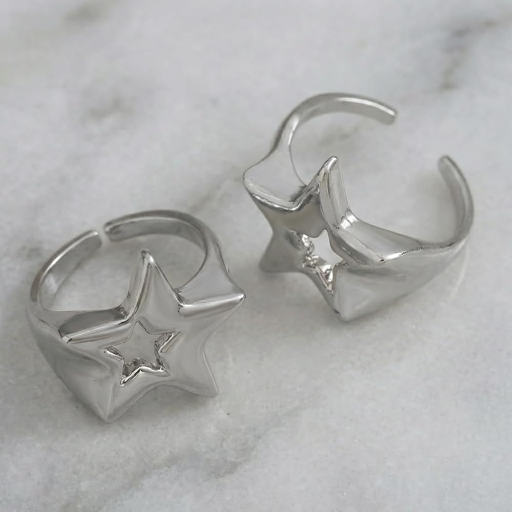 • TRENDY DESIGN:This cool 2-pack ring set. Featuring a bold star shape with a hollow center, these rings capture the essence of 2000s retro fashion, making them a accessory for streetwear, or hip-hop styles