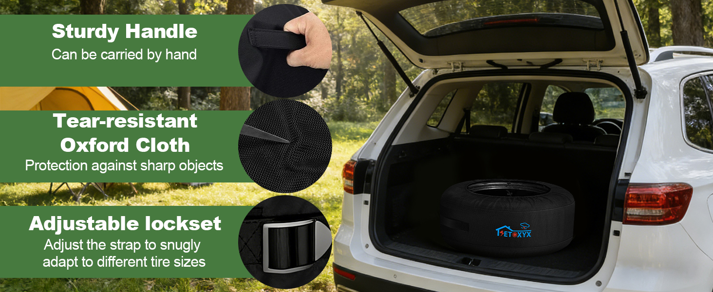 نسيج مقاوم للماء والبهتان: مصنوع من قماش أكسفورد 700D عالي القوة مع طلاء من البولي يوريثين، وتتميز الحقيبة بمقاومة فائقة للتمزق، وطارد للماء، وحماية من الأشعة فوق البنفسجية. إنه يتحمل سنوات عديدة من الشيخوخة في الهواء الطلق، ويحمي الإطارات بشكل فعال من أضرار أشعة الشمس والثلج والصدأ والخدوش والأوساخ أثناء التخزين في غير موسمها.