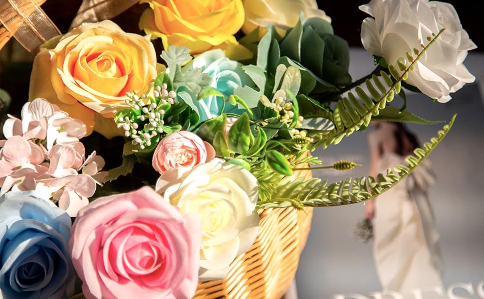 [المادة] الورود الاصطناعية مصنوعة من قماش وبلاستيك عالي الجودة. فهي غير سامة وعديمة الرائحة ومتينة ويمكن استخدامها لفترة طويلة. مثالية لوضعها في مزهرية أو ملء قطع مركزية للطاولة أو زينة الزفاف.