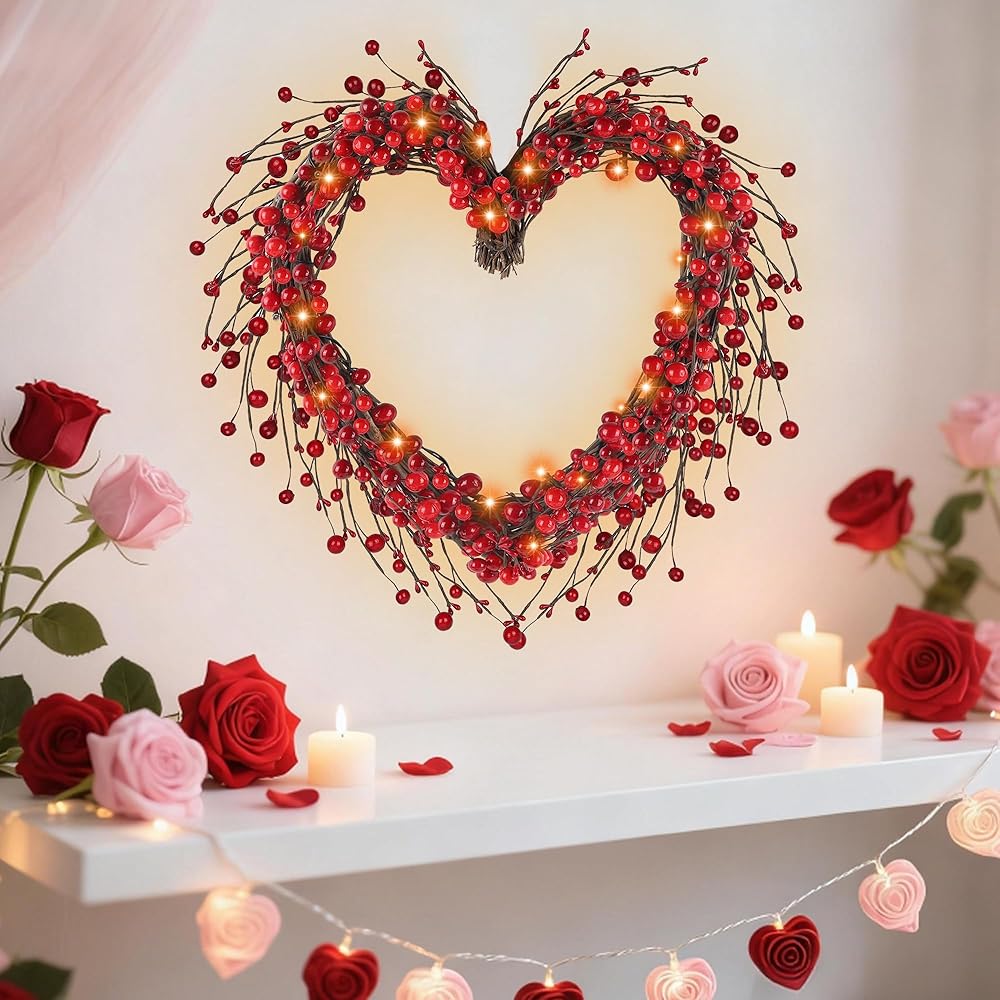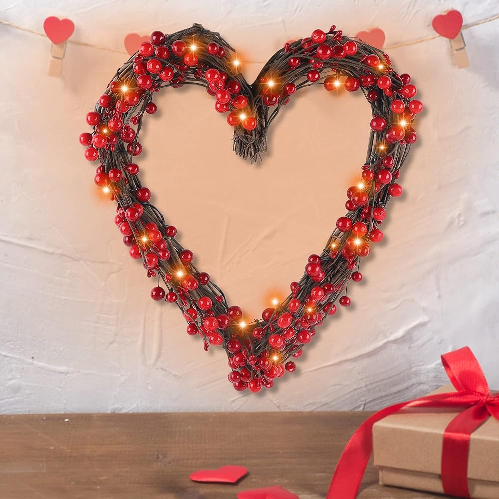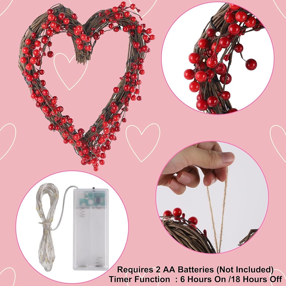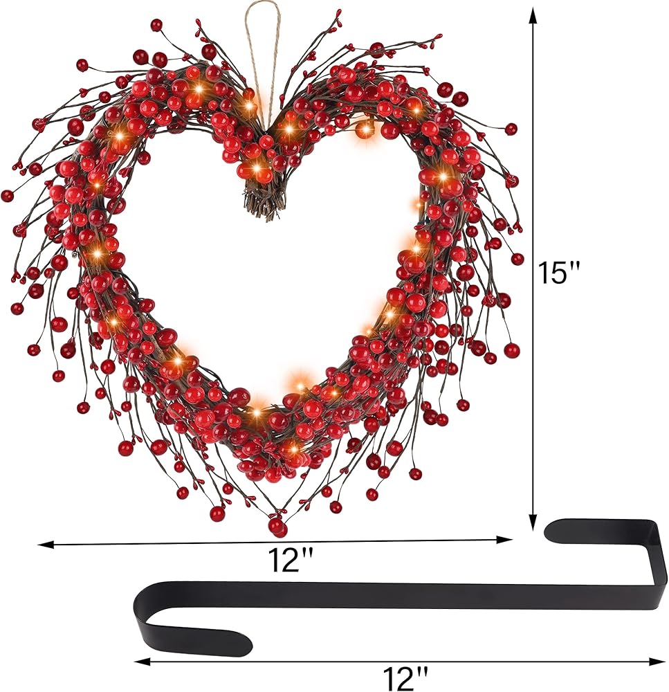 DR.DUDU إكليل عيد الحب، 15 بوصة LED مضاءة على شكل قلب التوت الأحمر أكاليل عيد الحب للباب الأمامي، أكاليل صناعية تعمل بالبطارية لتزيين المنزل لرف الجدار الداخلي الخارجي