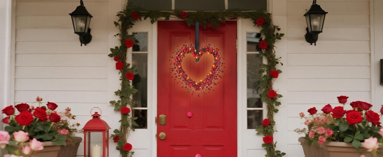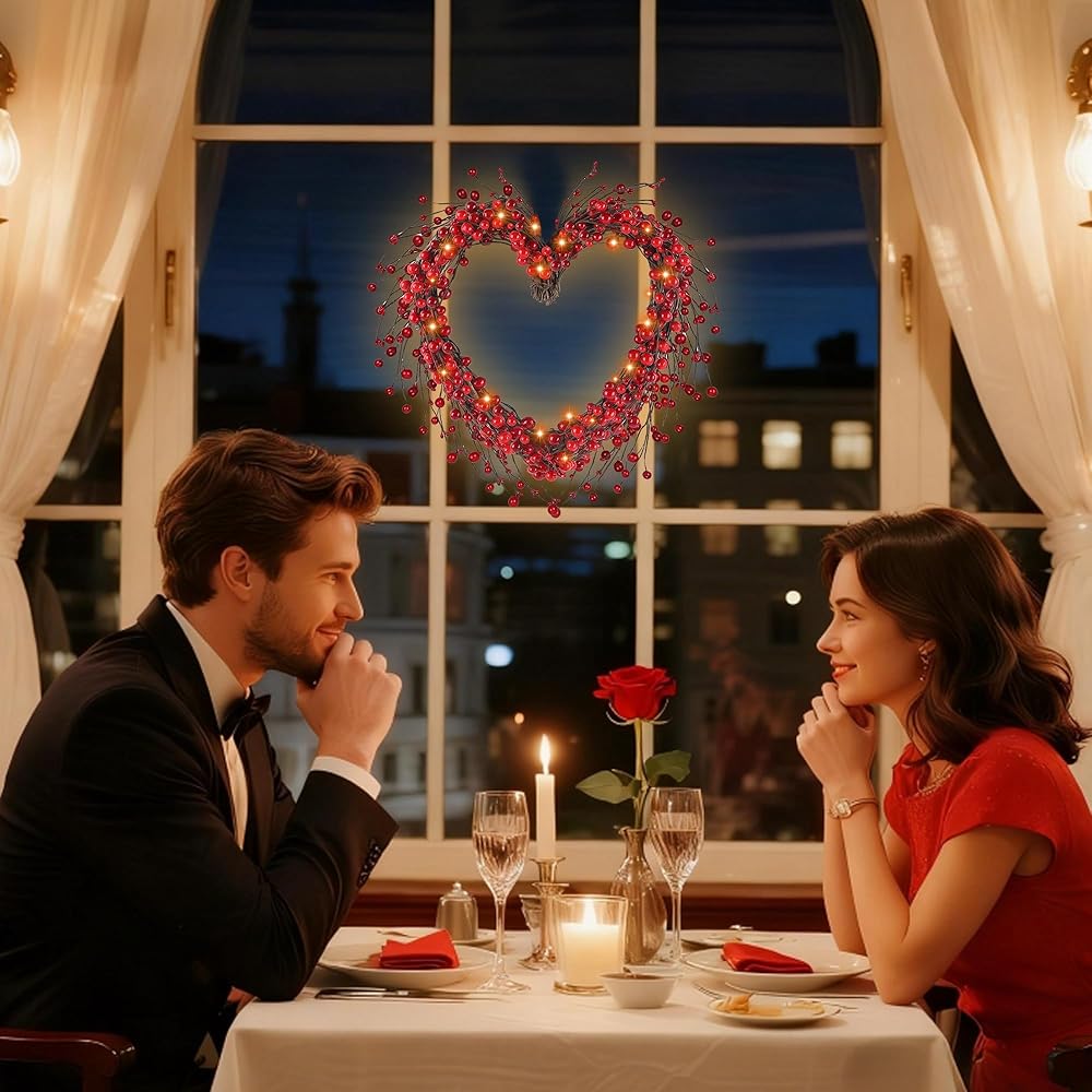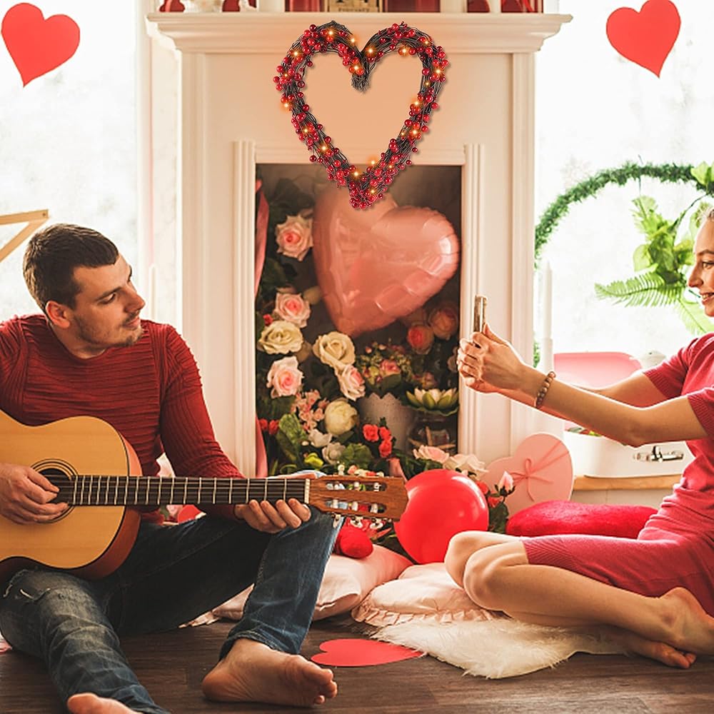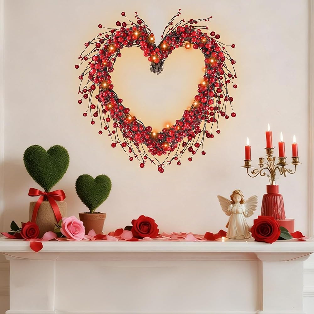 DR.DUDU إكليل عيد الحب، 15 بوصة LED مضاءة على شكل قلب التوت الأحمر أكاليل عيد الحب للباب الأمامي، أكاليل صناعية تعمل بالبطارية لتزيين المنزل لرف الجدار الداخلي الخارجي