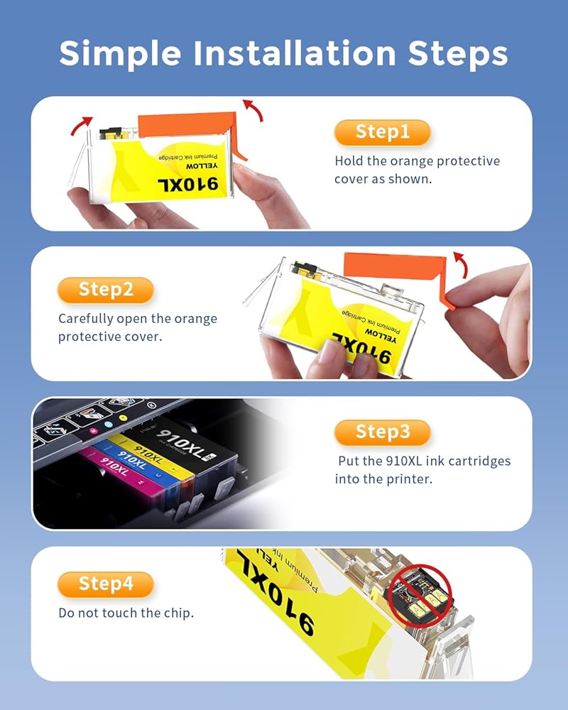 • 2. محتوى العبوة: 4 عبوات 910XL متوافقة مع مجموعة خراطيش الحبر HP 910XL ذات إنتاجية عالية للغاية (1 × 910XL أسود، 1 × 910XL سماوي، 1 × 910XL أرجواني، 1 × 910XL أصفر)