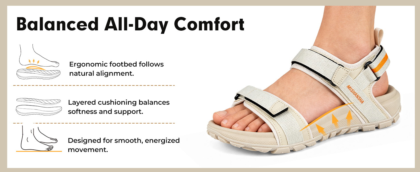 • دعم ومرونة قوس القدم: تم تصميم هذه الصنادل النسائية بهيكل داعم للقدم، وتوفر دعمًا يوميًا لقوس القدم للمشي دون الشعور بالصلابة. يسمح التصميم المفتوح عند الأصابع بحركة طبيعية لأصابع القدم، بينما ينحني جسم الحذاء المرن بسهولة للحصول على خطوة طبيعية ناعمة.