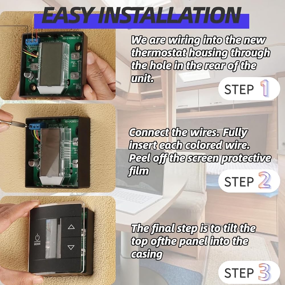 Easy 3-Wire Installation – Camper thermostat replacement designed for 12V RV systems; simply match wire colors, thread through back holes, and secure the panel for quick setup.