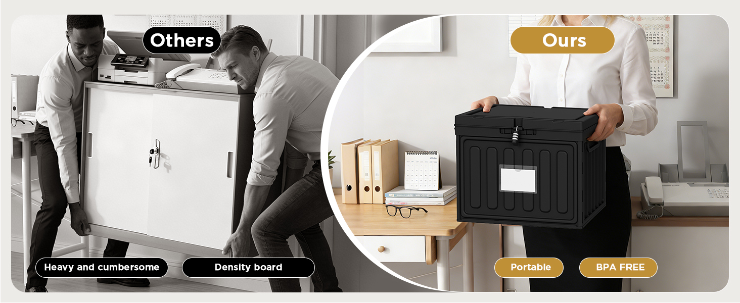 خفيفة الوزن وقابلة للتكديس: تزن جزءًا صغيرًا من الخزانات الخشبية. مقبض الحمل المدمج يجعل من السهل الإمساك به من أسفل المكتب، أو رميه في صندوق السيارة للاجتماعات خارج الموقع، أو الانتقال من غرفة النوم إلى المقهى. عند عدم الاستخدام، يتيح لك التصميم القابل للتكديس إنشاء برج تخزين معياري دون شغل مساحة الأرضية.