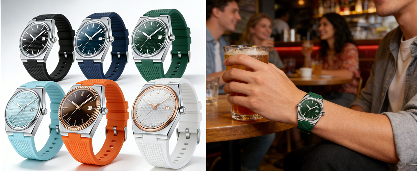 سيليكون فاخر (درجة FKM): مصنوع من سيليكون FKM عالي الجودة (مطاط الفلور) مع متانة استثنائية، توفر أحزمة الساعة للرجال والنساء لمسة ناعمة ومرنة تتوافق مع معصمك لراحة طوال اليوم. المادة مقاومة للماء والعرق والغبار، وهي مثالية للارتداء اليومي أو التدريبات أو النزهات غير الرسمية. مزود بإبزيم صلب من الفولاذ المقاوم للصدأ 316L، فهو يوفر أداءً طويل الأمد وإغلاقًا آمنًا يتحمل البلى والتمزق اليومي.