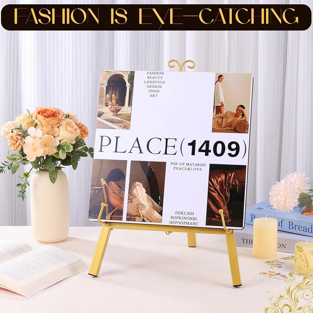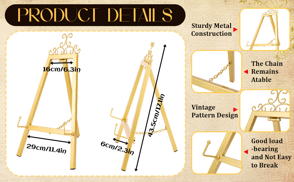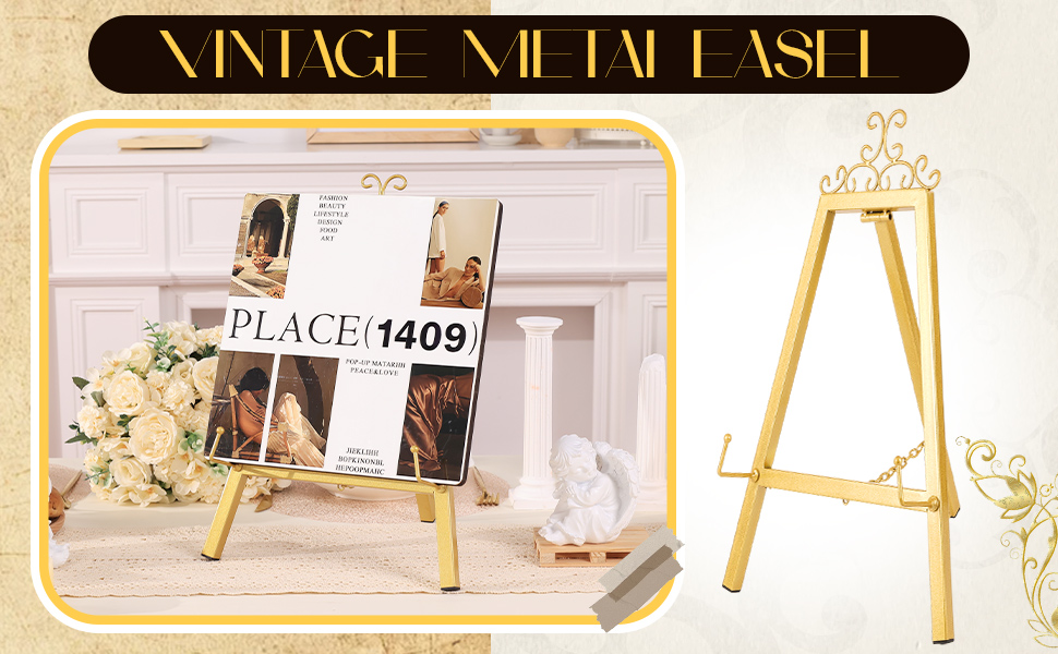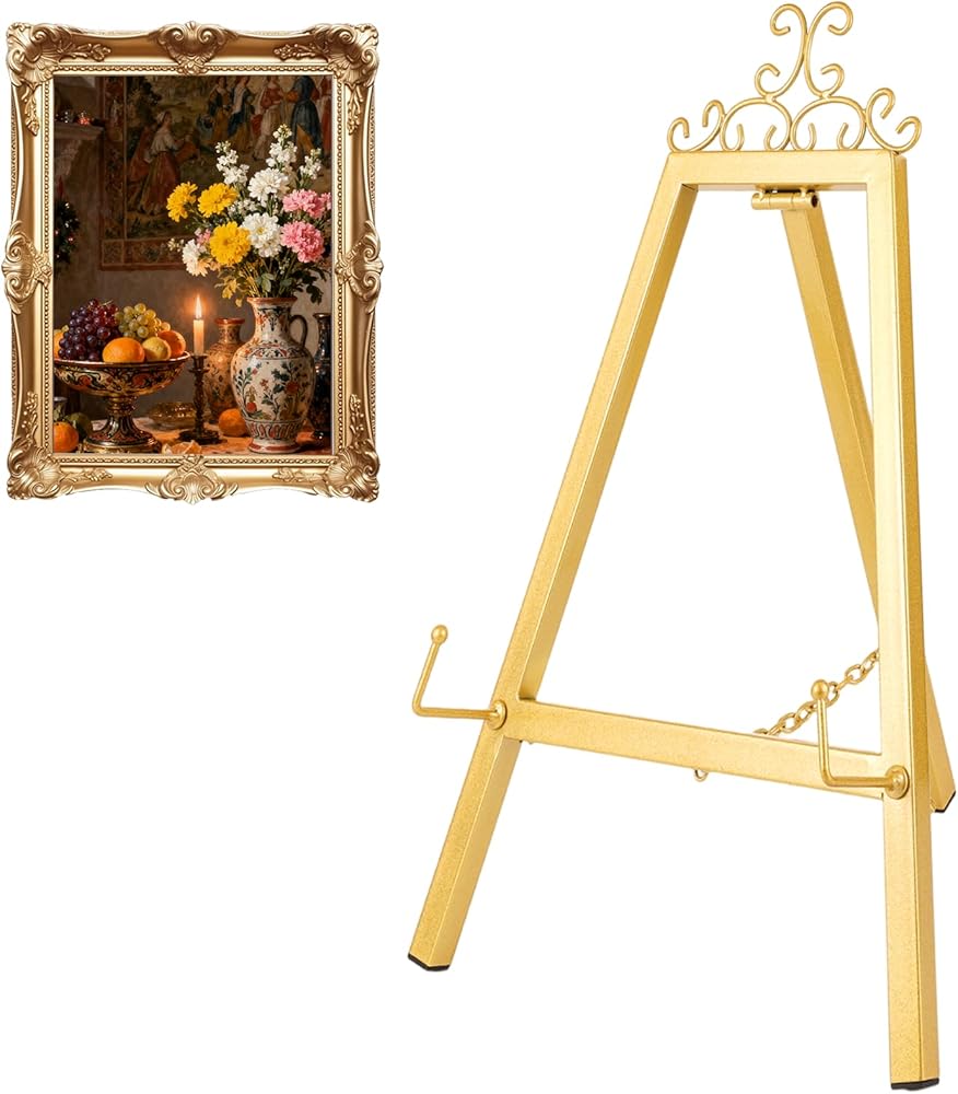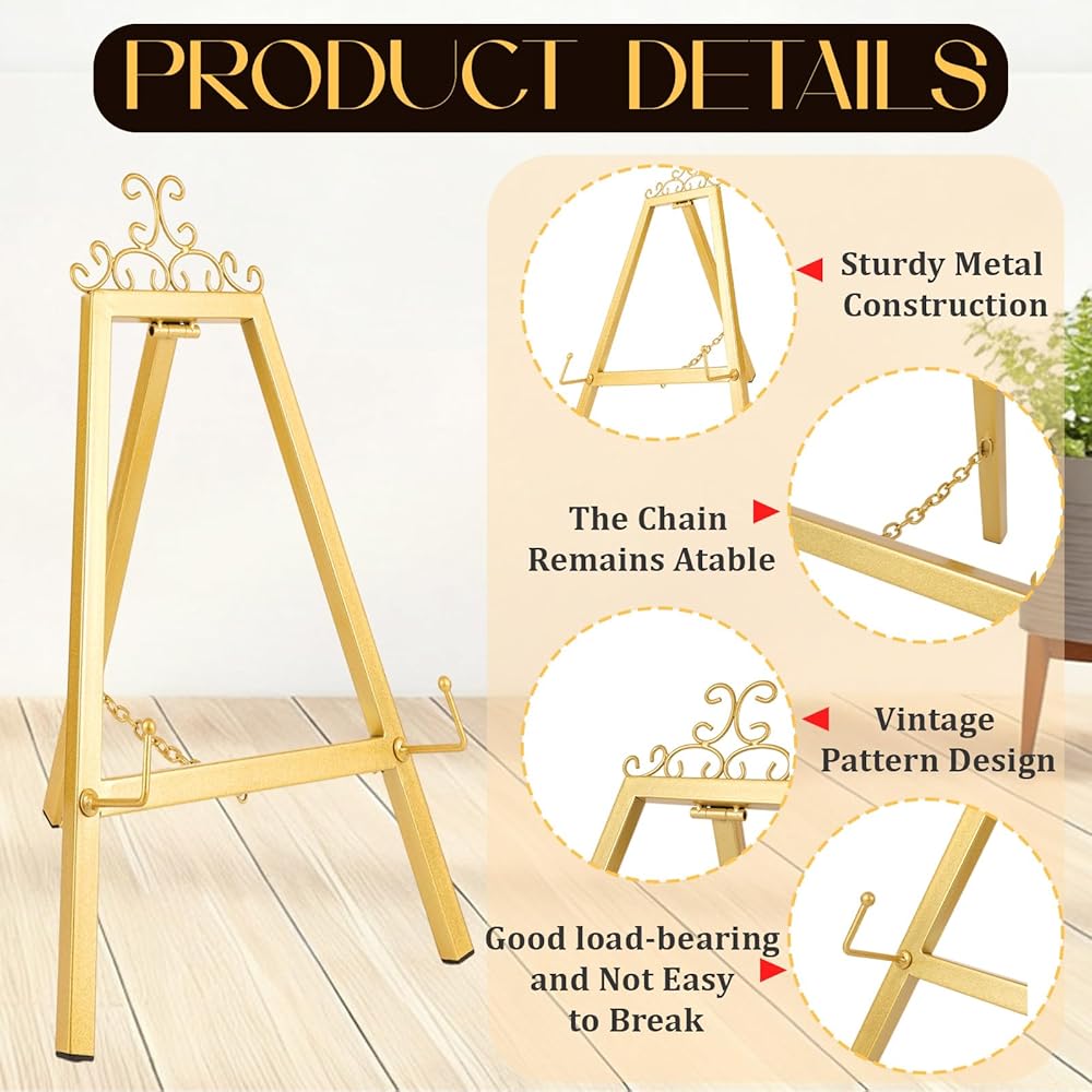 حامل حامل منضدية ذهبي مقاس 17 بوصة للعلامة، حامل عرض معدني مع دعم سلسلة، حامل فني للديكور العتيق للعرض، حامل إطار صورة على الطاولة لصور الزفاف المنزلية اللوحة الفنية