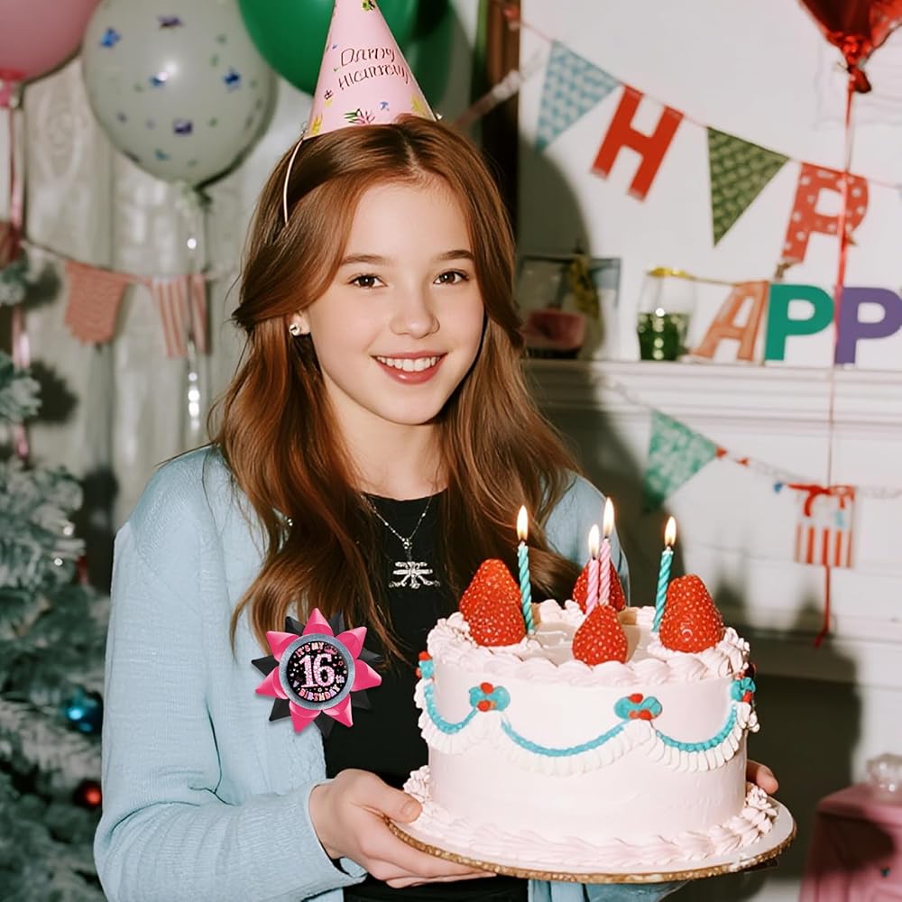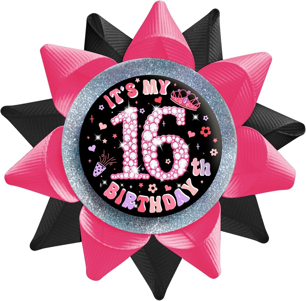 SKJIAYEE It's My 16th Birthday Buttons Pins for Girls Handmade(3.8*3.8inch), Black Pink Grosgrain Ribbon Tinplate Badge for Women 16th Birthday Party Decorations Supplies Ideas Gifts Jokes Favors