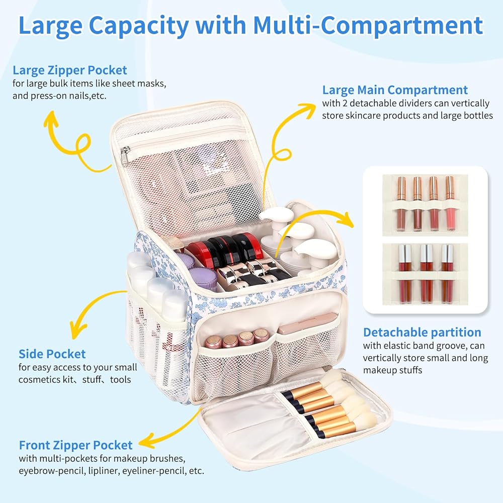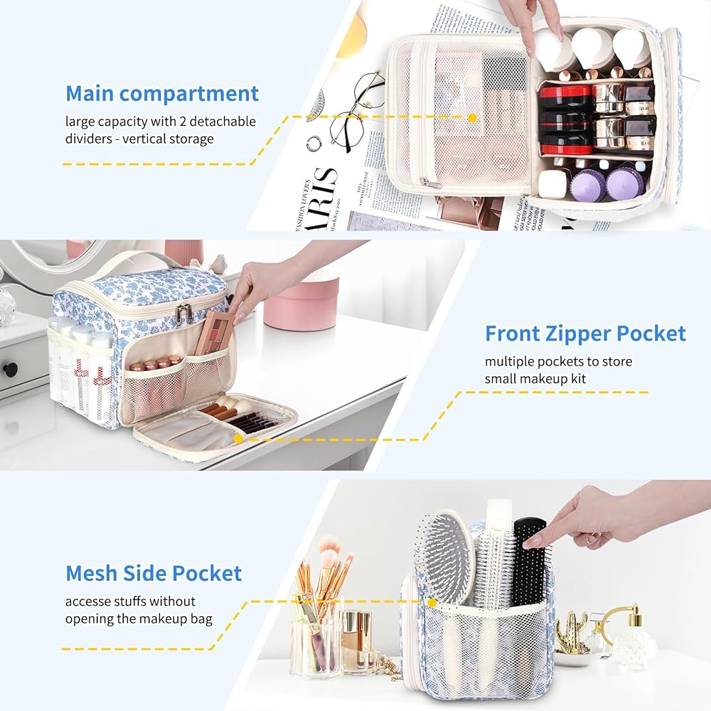 حقيبة مكياج ذات سعة كبيرة - تتميز حقيبة مستحضرات التجميل الواسعة والعميقة هذه بمساحة تخزين عمودية لحمل زجاجات العناية بالبشرة في وضع مستقيم؛ مع قسمين قابلين للإزالة في الحجرة الرئيسية لتخصيص المساحة والحفاظ على أغراضك منظمة