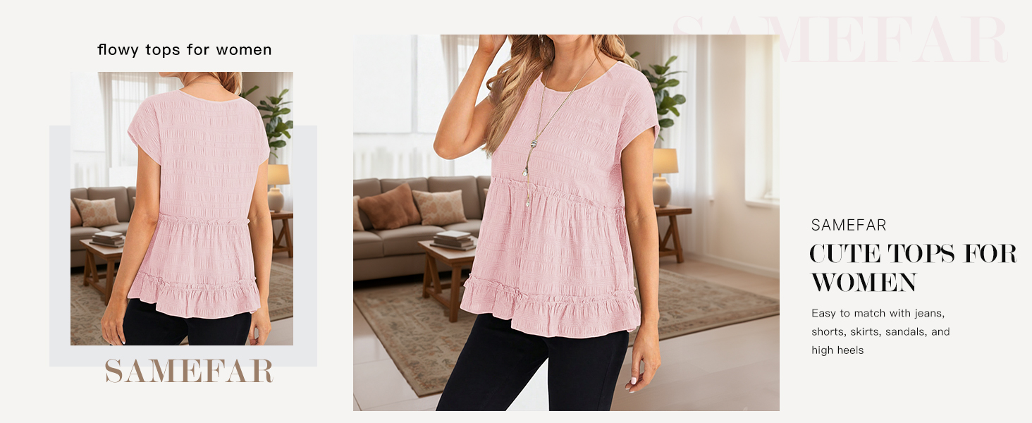 مطابقة: بلوزات لطيفة بأكمام قصيرة للنساء برقبة دائرية، وأكمام قصيرة، وحاشية واسعة، رائعة للارتداء مع السراويل القصيرة من الدينيم، والتنانير، والجينز، والسراويل، والكعب العالي والأحذية الرياضية.