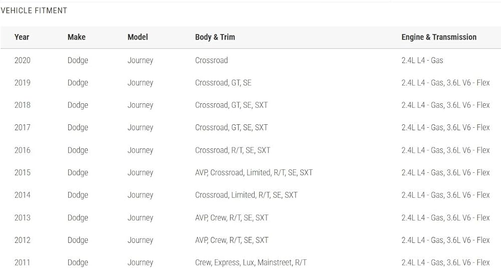 Fitment For: 2020 Dodge Journey Crossroad 2.4L L4 - Gas 2019 Dodge Journey Crossroad, GT, SE 2.4L L4 - Gas, 3.6L V6 - Flex 2018 Dodge Journey Crossroad, GT, SE, SXT 2.4L L4 - Gas, 3.6L V6 - Flex 2017 Dodge Journey Crossroad, GT, SE, SXT 2.4L L4 - Gas, 3.6L V6 - Flex 2016 Dodge Journey Crossroad, R/T, SE, SXT 2.4L L4 - Gas, 3.6L V6 - Flex 2015 Dodge Journey AVP, Crossroad, Limited, R/T, SE, SXT 2.4L L4 - Gas, 3.6L V6 - Flex 2014 Dodge Journey Crossroad, Limited, R/T, SE, SXT 2.4L L4 - Gas, 3.6L V6 - Flex 2013 Dodge Journey AVP, Crew, R/T, SE, SXT 2.4L L4 - Gas, 3.6L V6 - Flex 2012 Dodge Journey AVP, Crew, R/T, SE, SXT 2.4L L4 - Gas, 3.6L V6 - Flex 2011 Dodge Journey Crew, Express, Lux, Mainstreet, R/T 2.4L L4 - Gas, 3.6L V6 - Flex