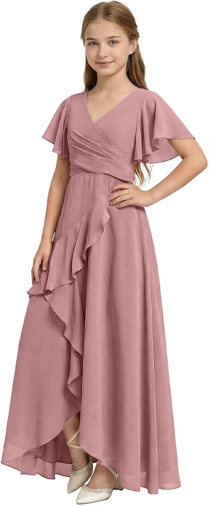 Features:Chiffon Jr Bridesmaid Dress for Teen Girls,Flower Girl Dress with slit,Flutter Sleeves Girls Bridesmaid Dresses,Chiffon Flower Girl Dresses for Wedding features Flutter Sleeves,V Neck,Ruffled Slit,Zipper and Bow Tie Back,Pleated,Floor-Length,A-Line Design,breezy,light fabric,practical and easy to wear,with a perfect fit!Your little princess will be excited about this gorgeous chiffon dress!