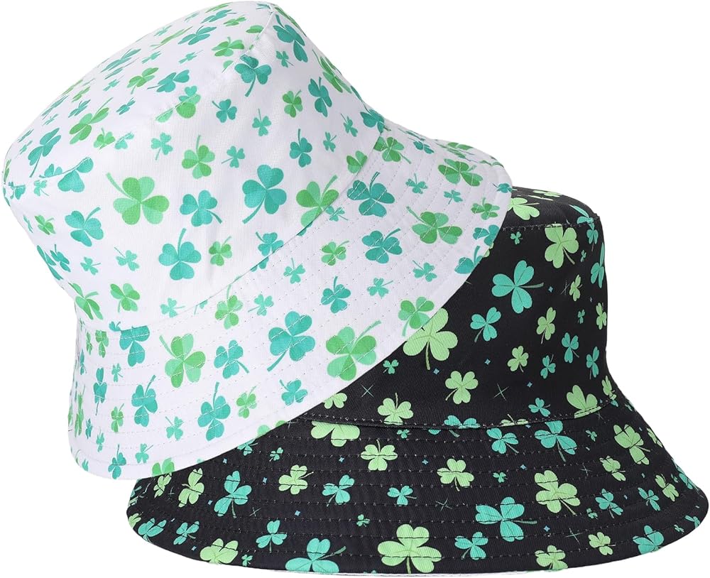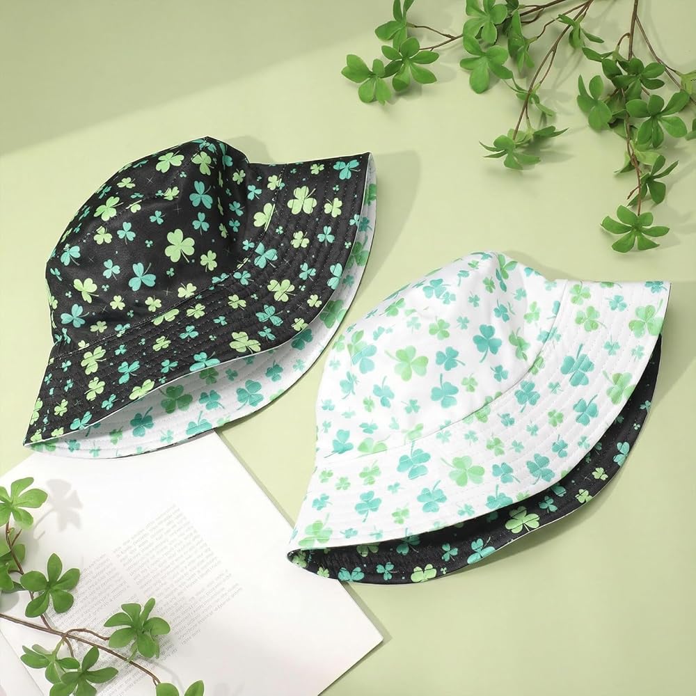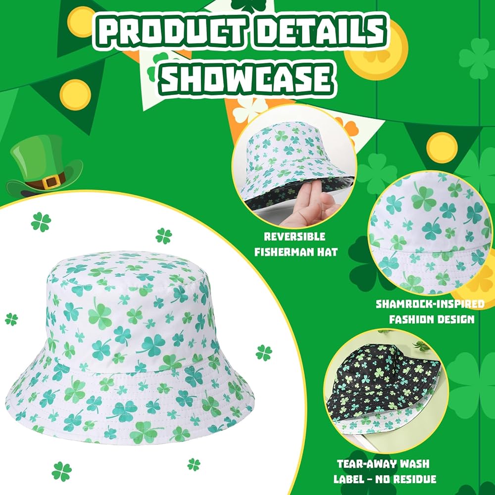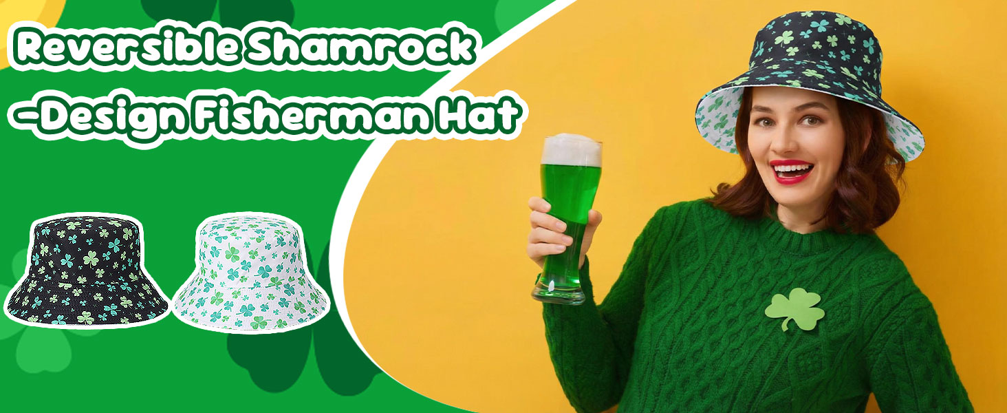 تصميم ذو وجهين: جانبان باللونين الأسود والأبيض؛ طباعة نبات النفل تجلب روح عيد القديس باتريك الفورية؛ اقلب الملابس أو الحالة المزاجية؛ قبعة واحدة تنتقل من العرض إلى الزحف إلى الحانة