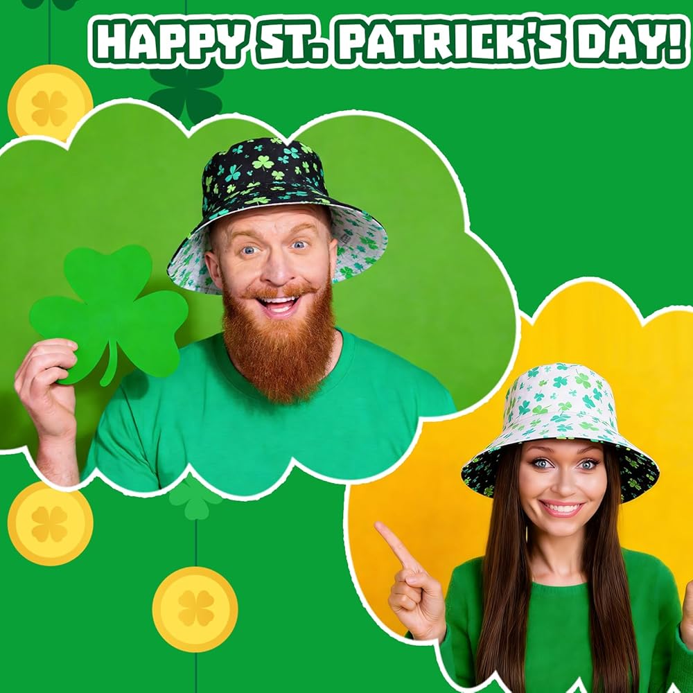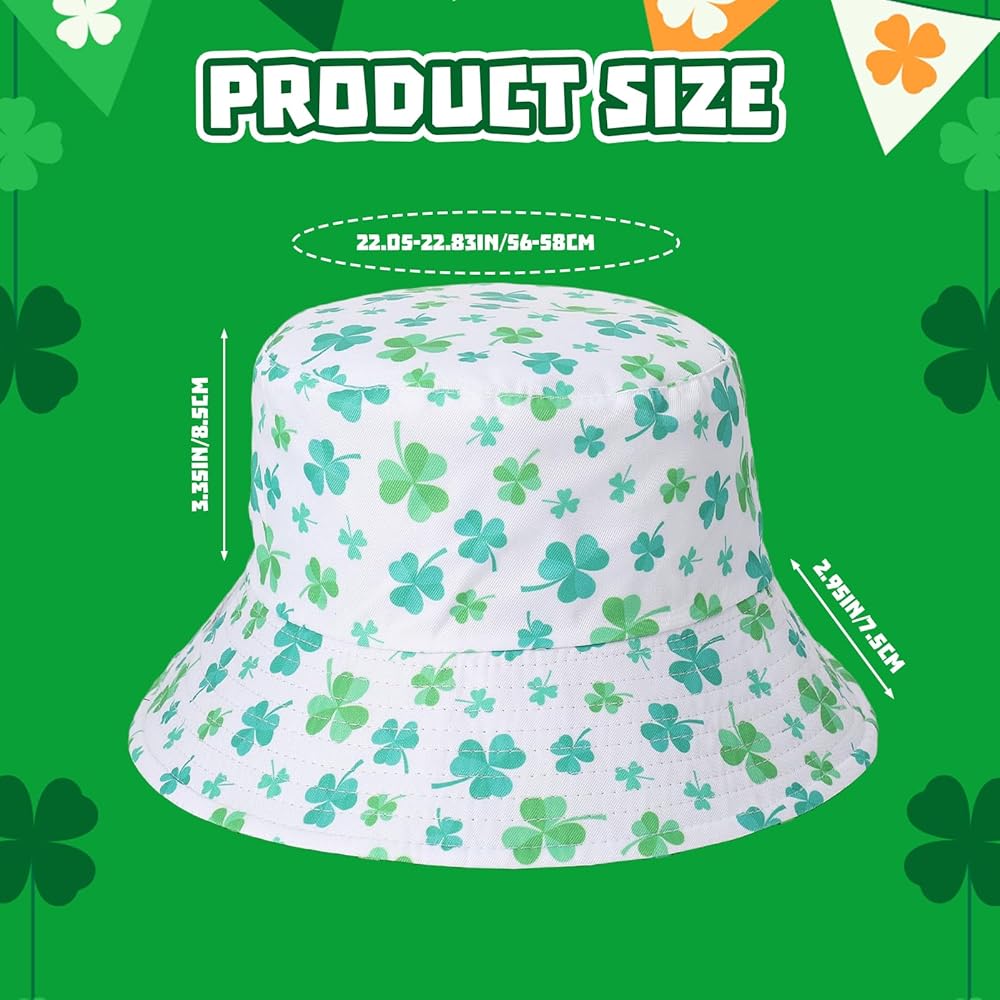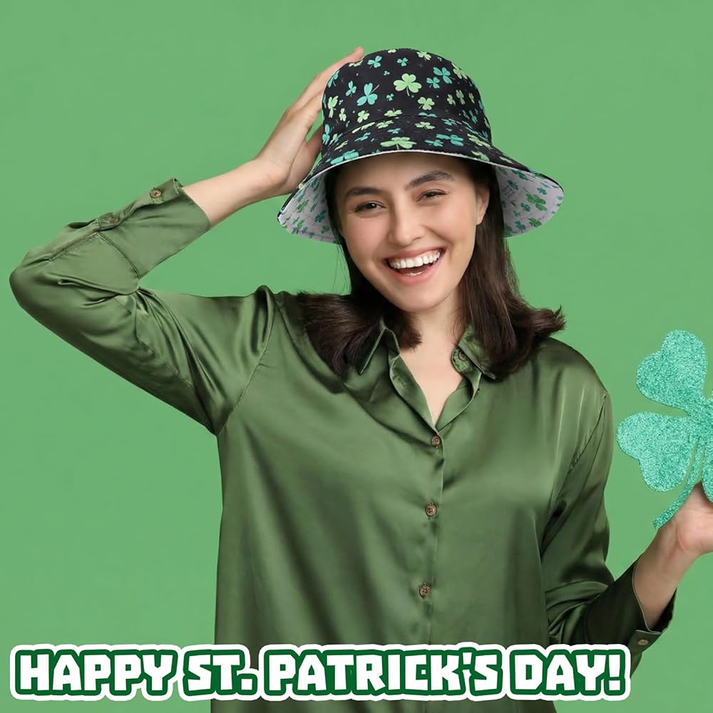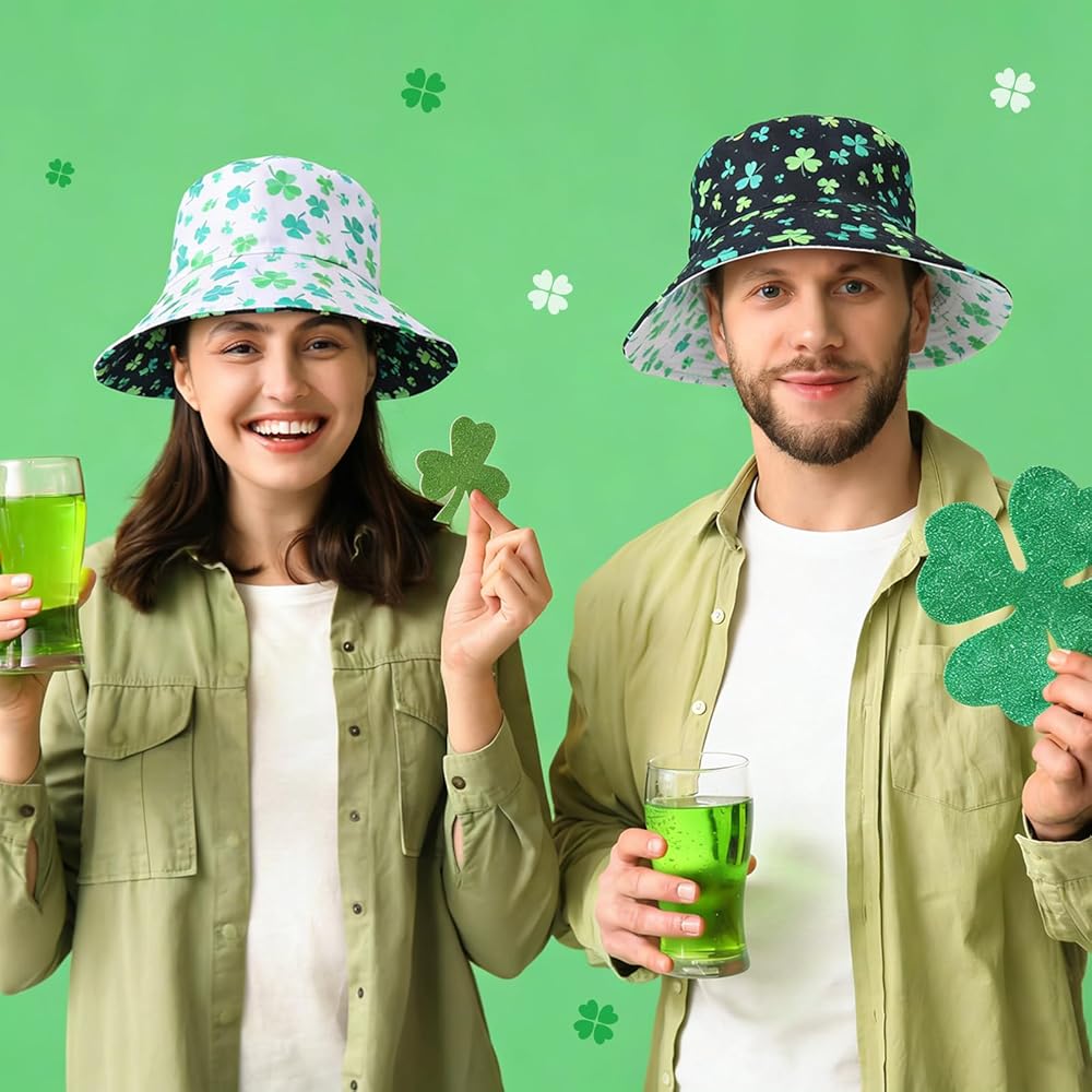 تصميم ذو وجهين: جانبان باللونين الأسود والأبيض؛ طباعة نبات النفل تجلب روح عيد القديس باتريك الفورية؛ اقلب الملابس أو الحالة المزاجية؛ قبعة واحدة تنتقل من العرض إلى الزحف إلى الحانة