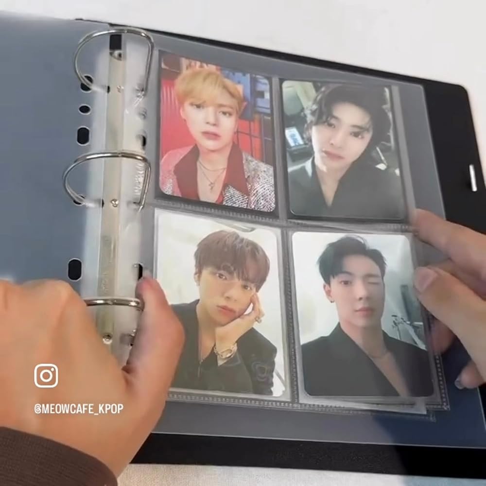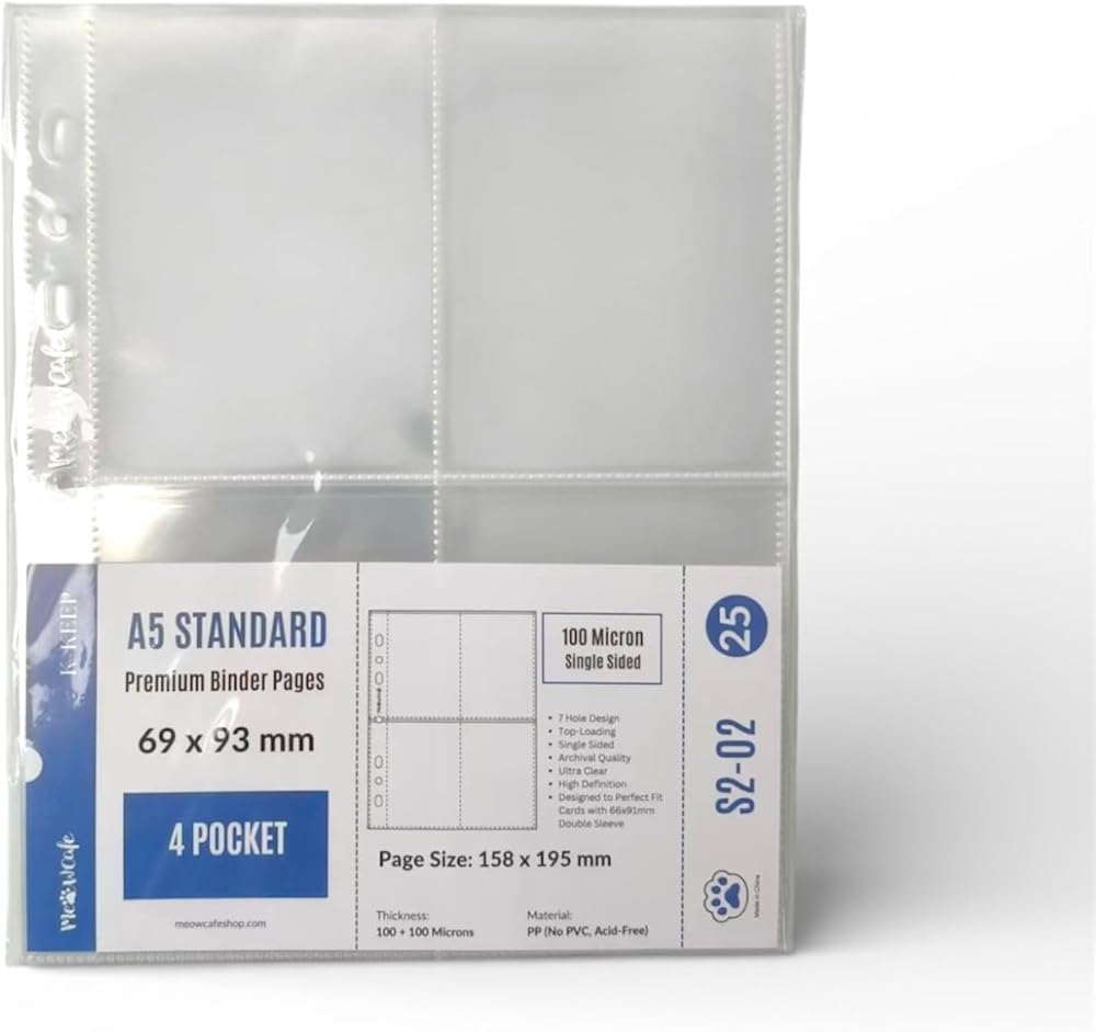 Meowcafe K-KEEP A5 Standard Single Sided 4 Pocket Premium Kpop Photocard Binder Pages, 69x93mm,Fit 66x91mm Sleeve, Pack of 25 These transparent pages feature 4 pockets, each measuring 69x93mm pocket size, designed to securely hold your double sleeved photocard. With a slim and compact A5 size, these pages seamlessly fit into both A5 6-Ring and 3-Ring binder, making perfect for your kpop photocard collection. Crafted from high-quality, 100 micron thick plastic, these pages provide excellent clarity and durability. The 7-hole punched design ensures a perfect fit in standard A5 binders, allowing for easy insertion and removal. This pack includes 25 single-sided pages, offering ample space for your organizational needs. Keep your kpop collection neatly arranged and easily accessible with the K-KEEP [A5 standard] 4 Pocket Premium Binder Pages.
