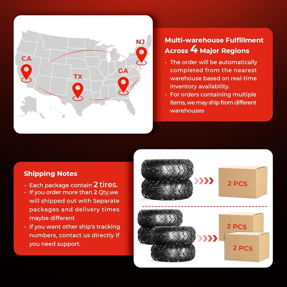 • الحزمة والإشعار: مجموعة من 4 إطارات ATV/UTV (أمامية وخلفية) - تتضمن إطارين أماميين مقاس 22x7-11 وإطارين خلفيين مقاس 22x10-9. الحافة (الإطارات) غير متضمنة. (ملاحظة: عند إجراء عملية شراء واحدة لأكثر من إطارين، سيتم تعبئة هذه الإطارات في عبوات متعددة قد لا تصل إلى وجهتها في نفس الوقت. يرجى الاتصال بنا للحصول على معلومات التتبع إذا لم تستلم الطلب بالكامل.)
